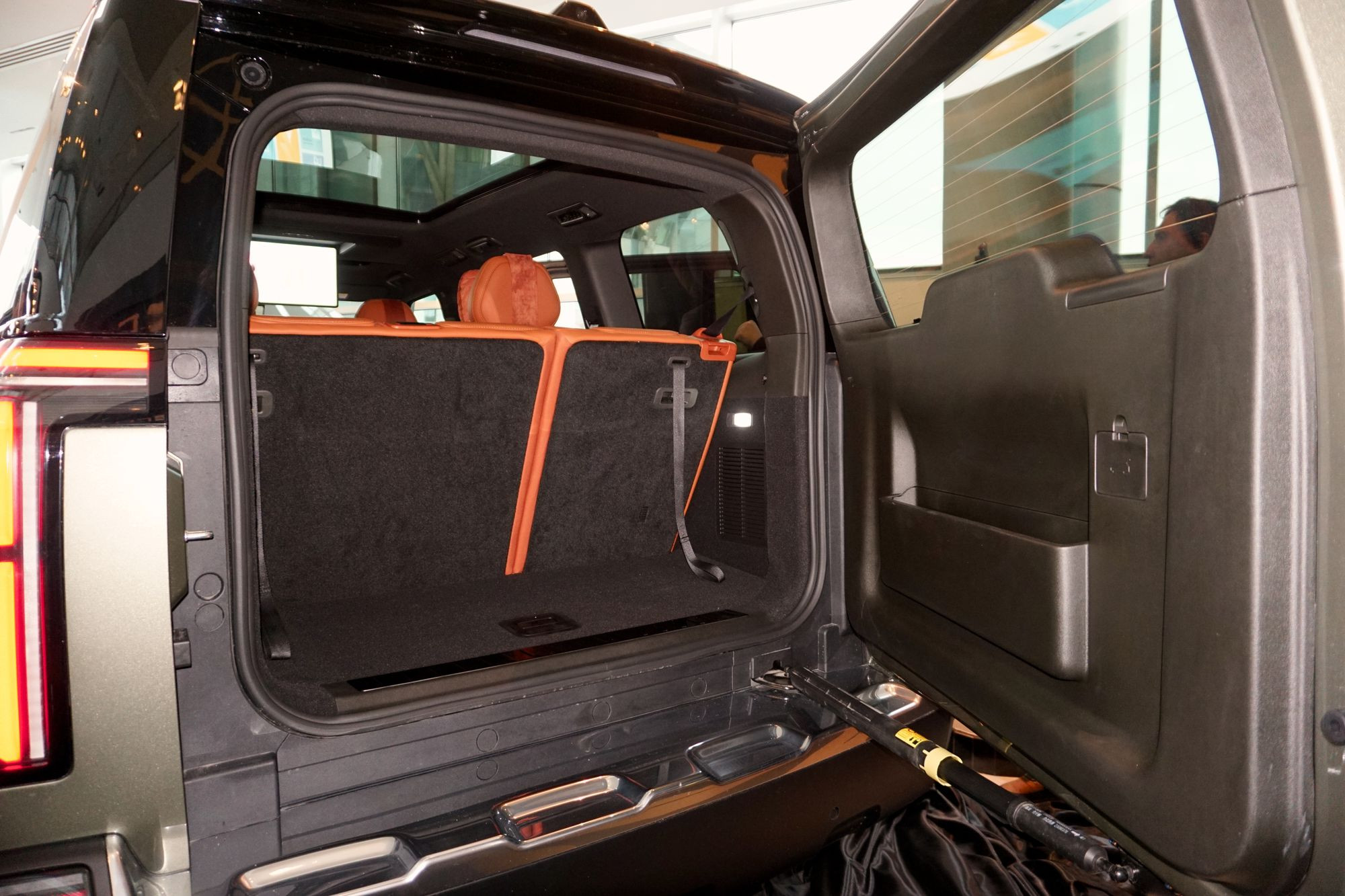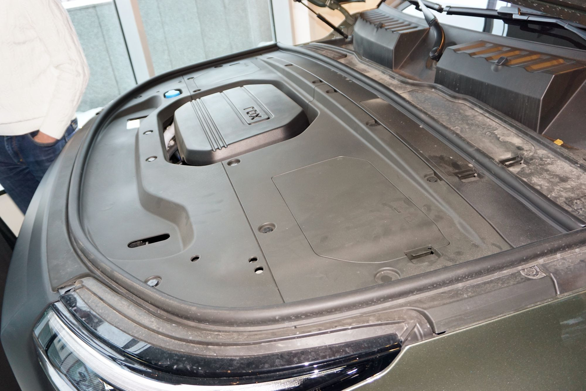 Объём багажника у 6-местной версии – 548 литров, у 7-местной – 535 литров. Судя по крохотному отсеку, в который помещается только коробка с фирменной зарядной станцией, объём указан при измерении под крышу. У «бизнес-версии» складывается только третий ряд – так багажник можно увеличить до 1404 литров, а у «семейной» – и второй, и третий. Таким образом можно получить отсек в 2202 литра.