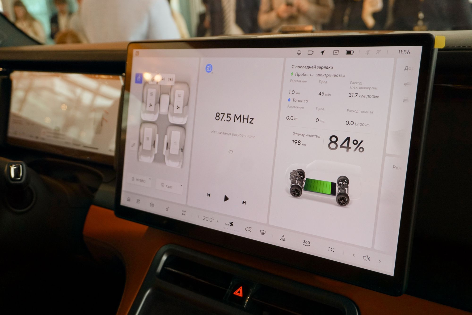 Под увесистым плоским капотом обнаружилась «турбополторашка» B15F производства китайской компании Xinchen China Power. Однако маленький 156-сильный мотор не связан с колёсами и работает в режиме генератора, заряжая батарею CATL ёмкостью 56 кВт·ч. Колёса вращают два электромотора: 204 л.с. выдаёт передний и 272 л.с. – задний. Совокупная мощность силовой установки – 476 сил, крутящий момент – 740 Н·м.