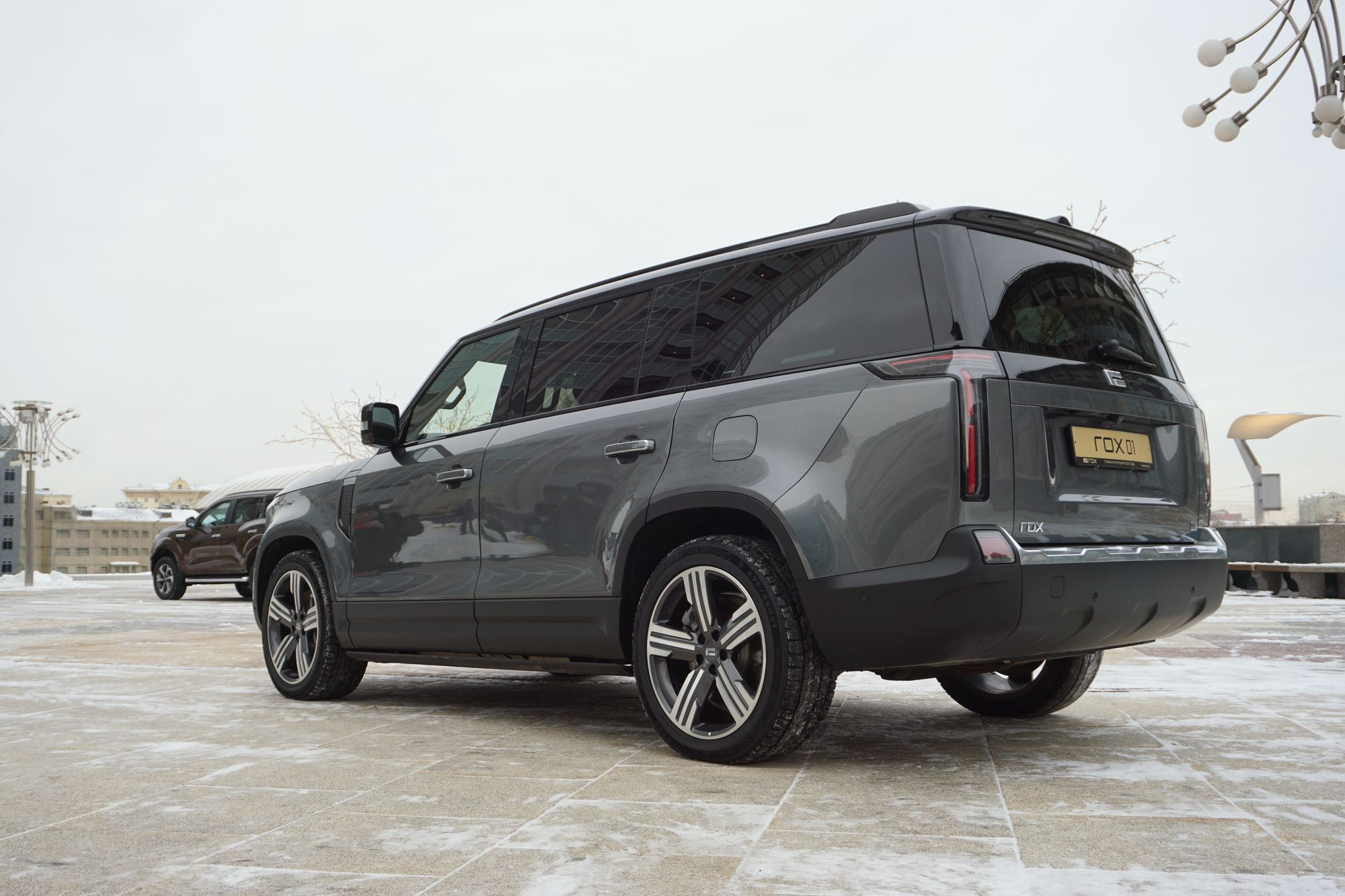 Машина получилась большая – 5295 мм длины (с учетом запаски), 1980 мм ширины и 1869 мм высоты при колёсной базе в 3010 мм. Для внедорожника, каковым его считают в Rox, геометрия не впечатляет: угол въезда – 22,2 градуса, съезда – 25,1 градуса, рампы – 19,7 градуса, а максимальная глубина преодолеваемого брода – 700 мм. Но дорожный просвет из-за отсутствия пневмоподвески не регулируется – это «фиксированные» 215 мм. Штатные колёса – массивные «катки» 275/45 R21. Автомобиль получился довольно тяжёлым – минимум 2580 кг снаряжённой массы.