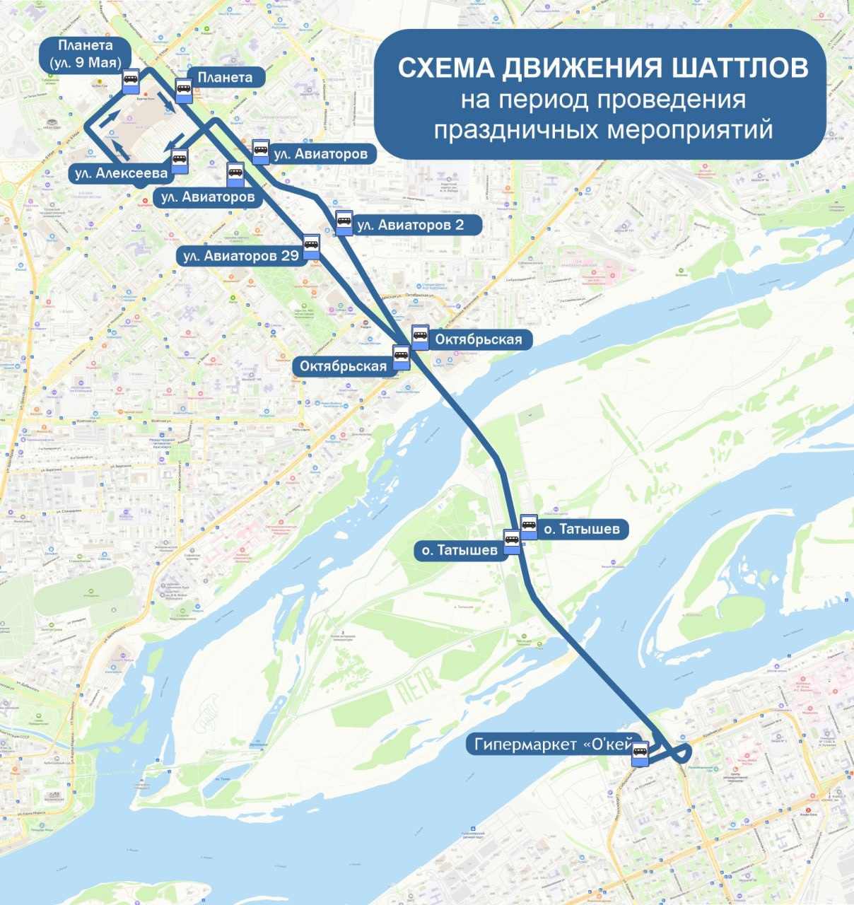 Автобусы будут курсировать 29 июня от гипермаркета «О'кей» (остановка «Нефтебаза») и ТЦ «Авиатор».