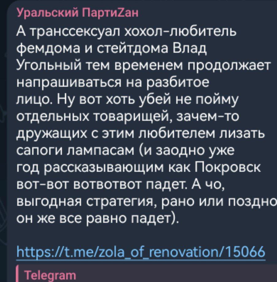 Давай я скажу максимально корректно по отношении к Партии (хотя вы этого не заслуживаете в последнее время): хохлы если вальнут кого-то из "наших" или "охраноты", ваша партия-мученик пойдет одним из первых подозреваемых просто по факту, что вы продемонстрировали, что 80% работы сделать способны. В итоге и компетентным органам куча работы лишней, и в медийке говна навалом, и у вас самих проблем дохуя.