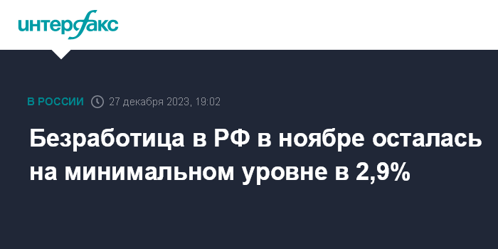 Москва. 27 декабря. INTERFAX.RU - Безработица в России в ноябре 2023 года удерживалась на достигнутом в октябре уровне в 2,9%, соответствующем минимальному значению за весь период наблюдений показателя с 1991 года, сообщил в среду Росстат.