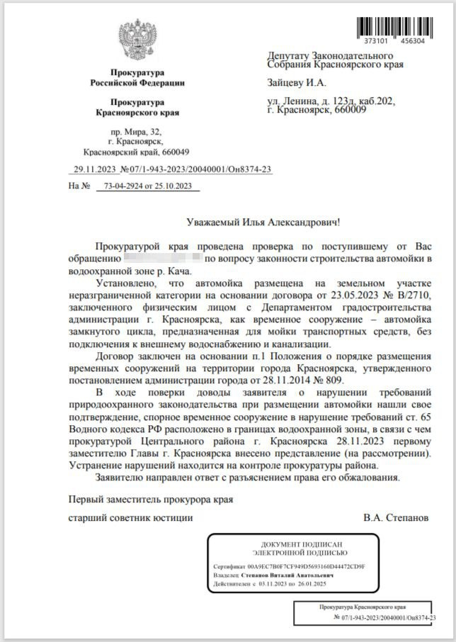 Муниципальную автомойку построили напротив Юдинского сквера. Еще в ноябре прошлого года выяснилось, что она стоит в водоохранной зоне Качи. Тогда в прокуратуре вынесли представление мэрии и потребовали устранить нарушение (очевидно, демонтировать строение), говорилось в ответе депутату.