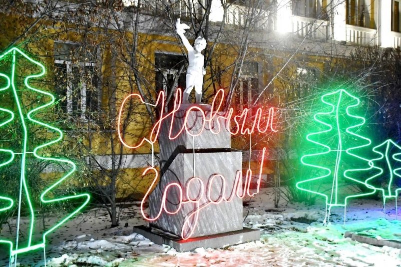 В палисаднике на скульптуру мальчика с голубем прикрепили неоновую вывеску "С Новым Годом!", по периметру здания поставили иллюминацию: елки, снеговики. Над входом в Дом Офицеров также была оборудована вывеска с новогодним поздравлением, а за ней поставили объемную разноцветную иллюминацию в виде елки.
