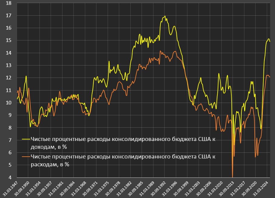 Чистые процентные расходы к доходам консолидированного бюджета составили 14.9% в конце 2024, что сопоставимо с показателями в середине 1996, тогда как исторический максимум был на уровне 17% в 1992 году. Для сравнения, в 2019 было около 11.7%.