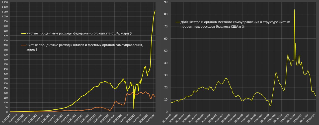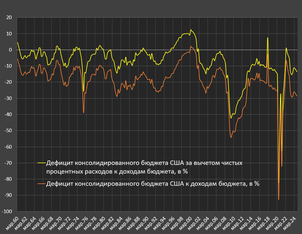 Экспоненциальный рост чистых процентных расходов обусловлен резким расширением долга на фоне экстремально высокой стоимости заимствований.
