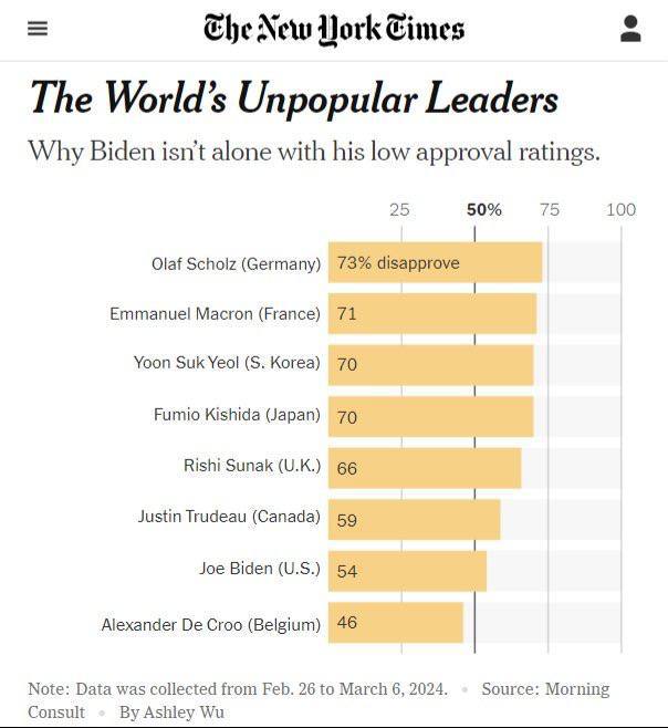 Публикуем рейтинг самых непопулярных руководителей стран мира. "Золото" и "серебро" взяли канцлер ФРГ Олаф Шольц и президент Франции Эммануэль Макрон.