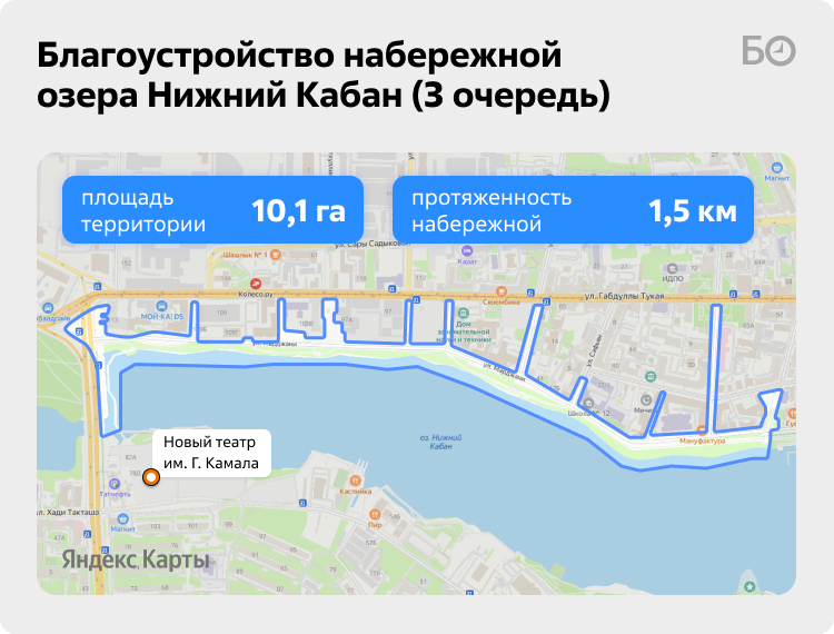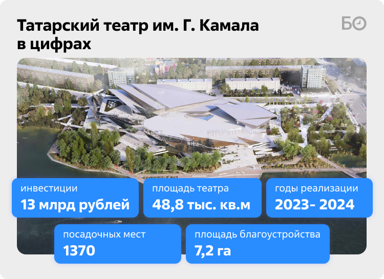 Проект благоустройства прилегающего участка к театру по заказу «Главинвестстрой РТ» разработало бюро «Архитектурный десант» (куратор проекта Институт развития городов РТ). На 7,2 га вокруг театра разобьют полноценный парк. Напомним, что изначальная площадь территории на ул. Хади Такташа по театр, которую выбрали еще в 2021-м во время объезда исторического центра президентом РТ Рустамом Миннихановым, была вдвое меньше. До 2020 года девелоперы планировали здесь застройку. К примеру, UD Group (партнерская компания «Унистроя») хотела воплотить на берегу озера бизнес-центр. Но эти земли у застройщиков изъяли и отдали Камаловскому.