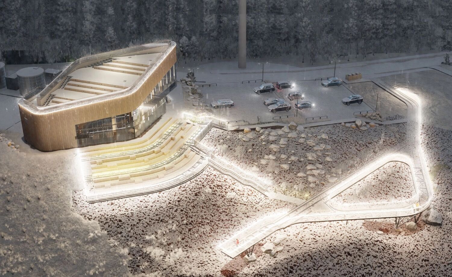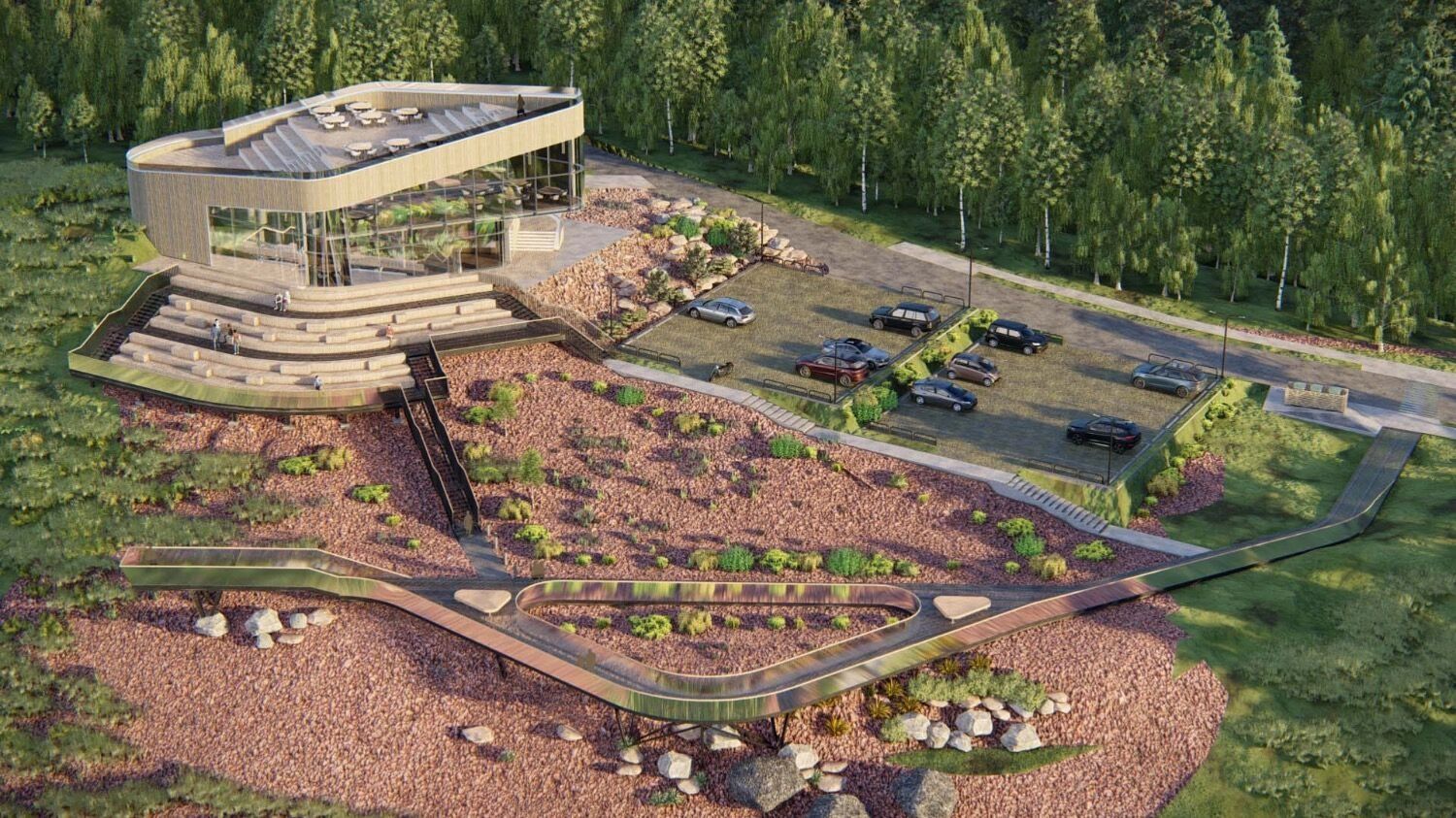 Здание визит-центра будет двухэтажным — его построят на верхней точке сопки, над амфитеатром. Как пишут архитекторы, объект, по задумке, будто «вырастает» из амфитеатра.