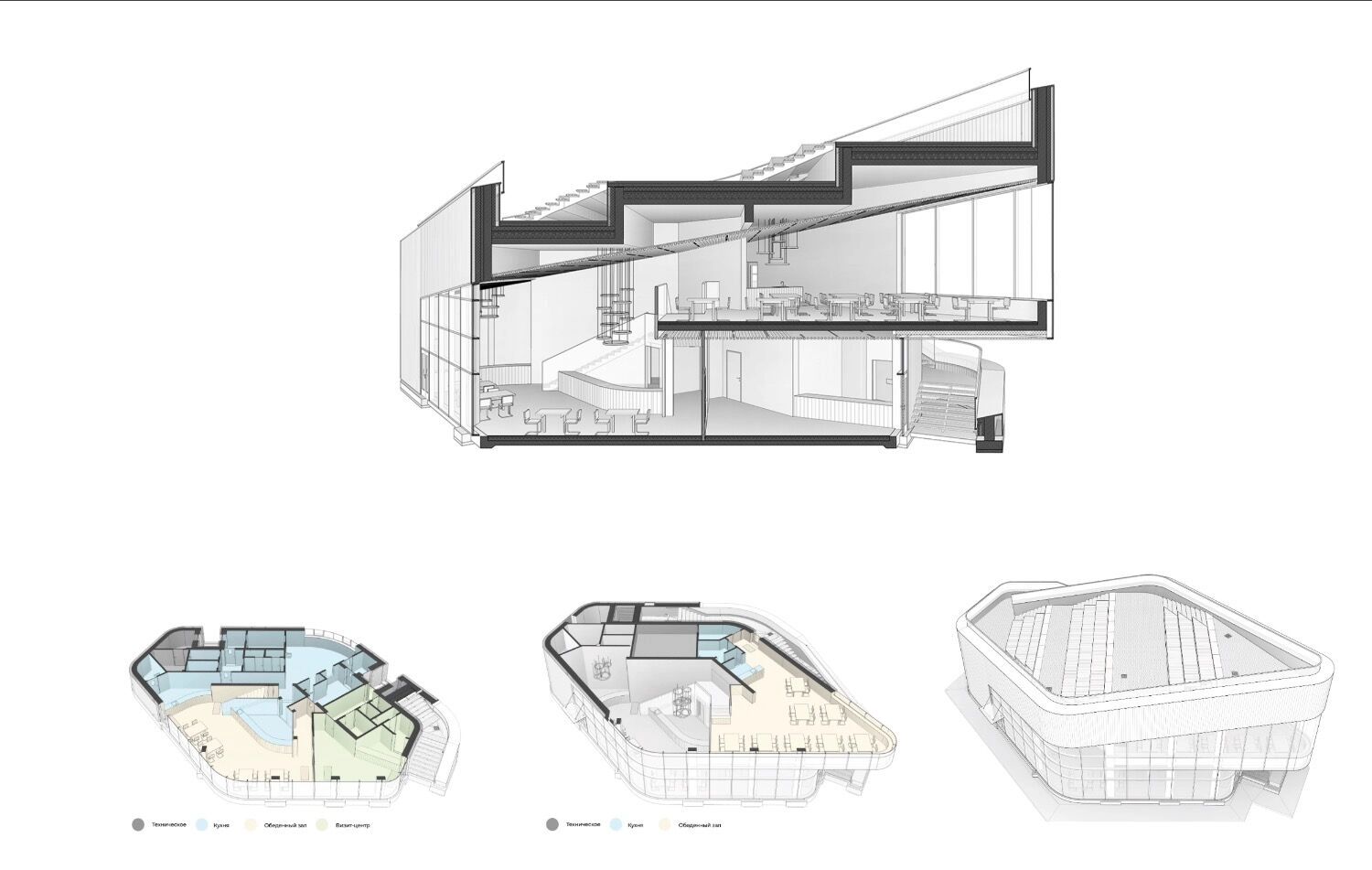 «На первом этаже расположится входная группа с ресепшеном, сувенирной лавкой, гардеробом и туалетами, а также технологические помещения кафе и обеденный зал с барной зоной. На втором этаже разместят дополнительный уровень обеденного зала с возможностью выхода на эксплуатируемую кровлю», — пишут архитекторы.