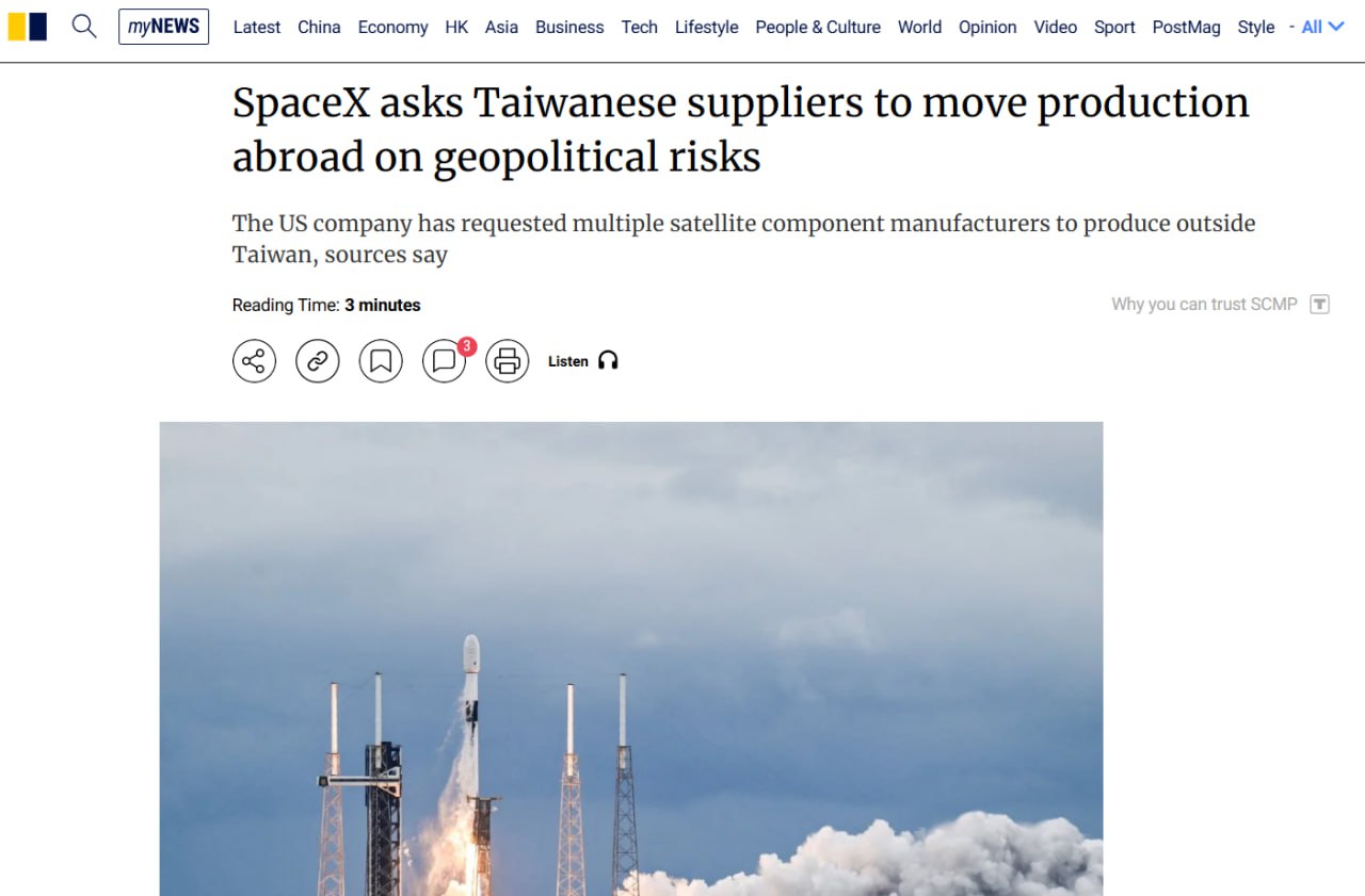 πΉπΌπSpaceX ΠΠ»ΠΎΠ½Π° ΠΠ°ΡΠΊΠ° ΠΏΡΠΎΡΠΈΡ ΡΠ°ΠΉΠ²Π°Π½ΡΡΠΊΠΈΡ ΠΏΠΎΡΡΠ°Π²ΡΠΈΠΊΠΎΠ² ΠΏΠ΅ΡΠ΅Π½Π΅ΡΡΠΈ ΠΏΡΠΎΠΈΠ·Π²ΠΎΠ΄ΡΡΠ²ΠΎ Π·Π° ΡΡΠ±Π΅ΠΆ ΠΈΠ·-Π·Π° Π³Π΅ΠΎΠΏΠΎΠ»ΠΈΡΠΈΡΠ΅ΡΠΊΠΈΡ ΡΠΈΡΠΊΠΎΠ² β SCMP