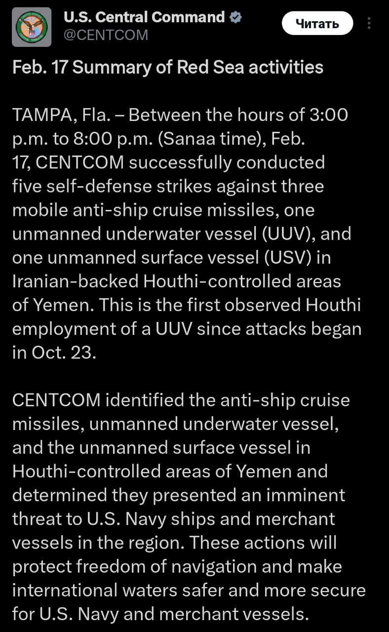 ⚡️Хуситы впервые применили в Красном море морские дроны. Об этом сообщает Центральное командование Вооруженных сил США (CENTCOM). Беспилотник был обнаружен 17 февраля во второй половине дня.