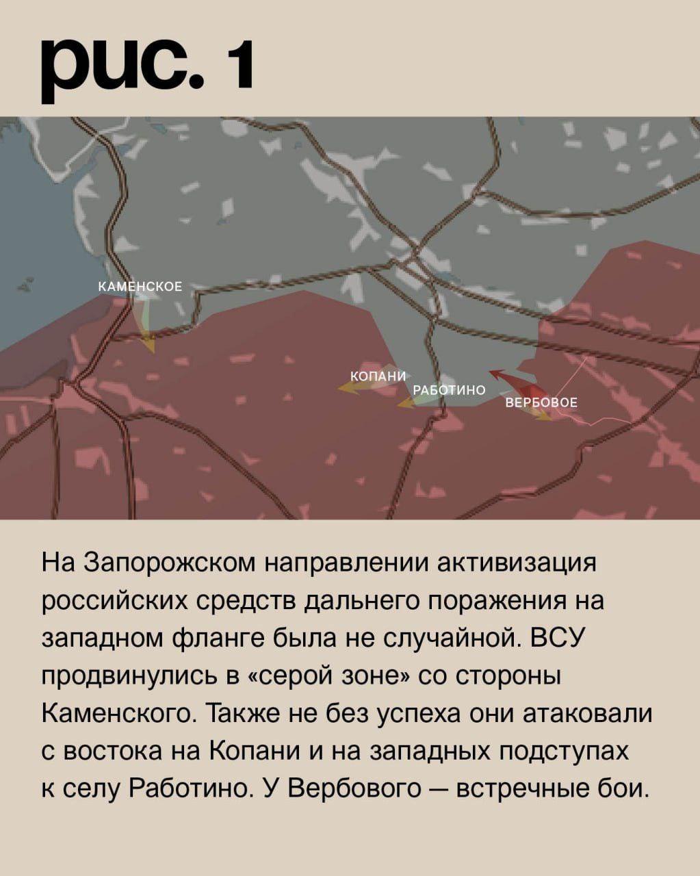 На Запорожском направлении активизация российских средств дальнего поражения на западном фланге была не случайной. ВСУ продвинулись в «серой зоне» со стороны Каменского. Также не без успеха они атаковали с востока на Копани и на западных подступах к селу Работино. У Вербового – встречные бои. (Рис. 1)