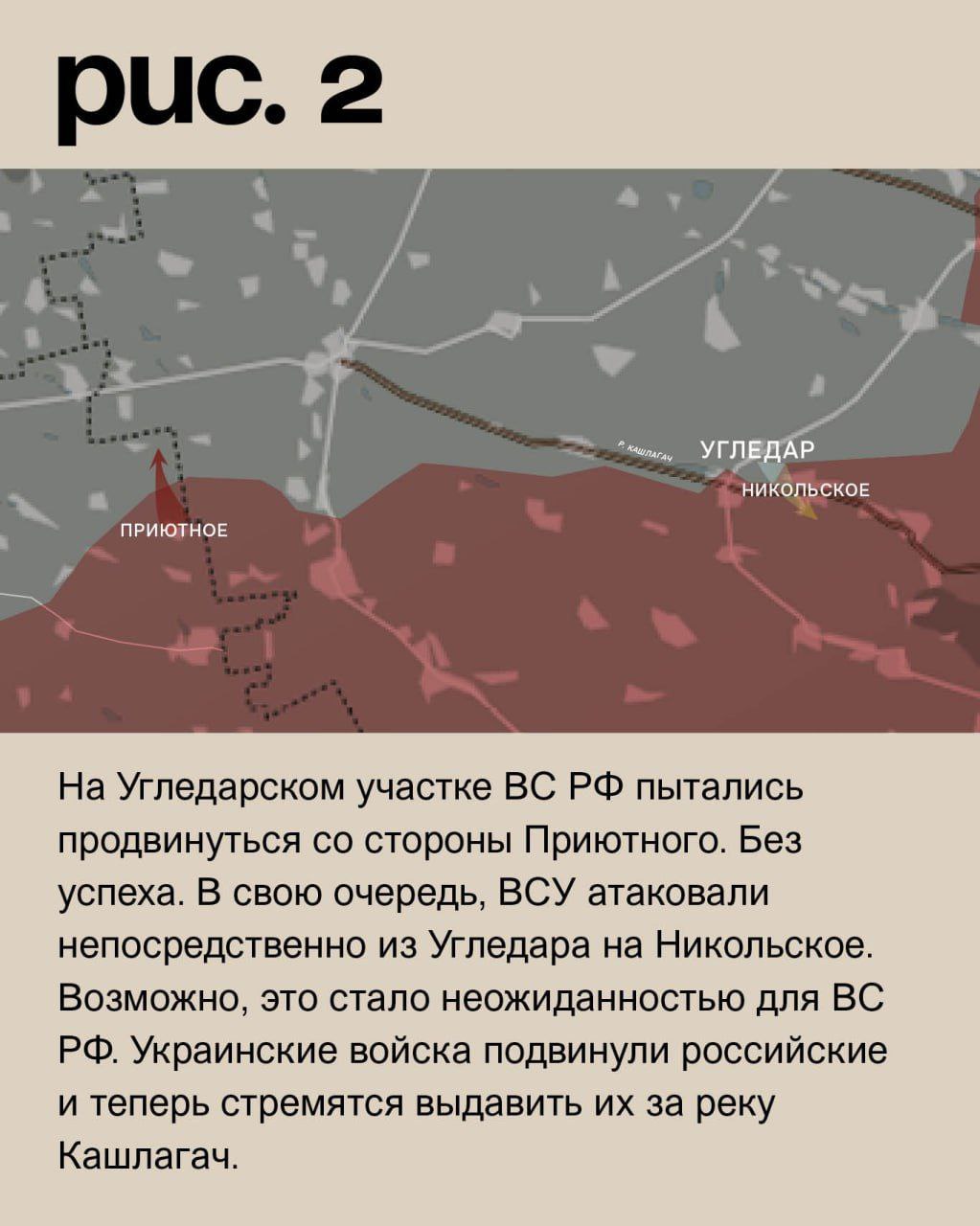 На Угледарском участке ВС РФ пытались продвинуться со стороны Приютного. Без успеха. В свою очередь, ВСУ атаковали непосредственно из Угледара на Никольское. Возможно, это стало неожиданностью для ВС РФ. Украинские войска подвинули российские и теперь стремятся выдавить их за реку Кашлагач. (Рис. 2)