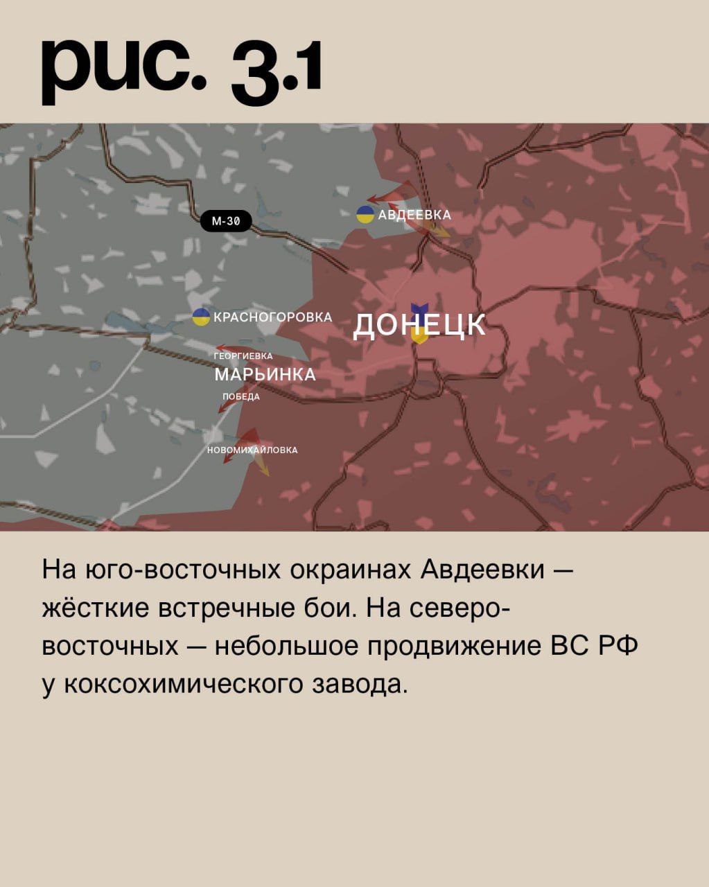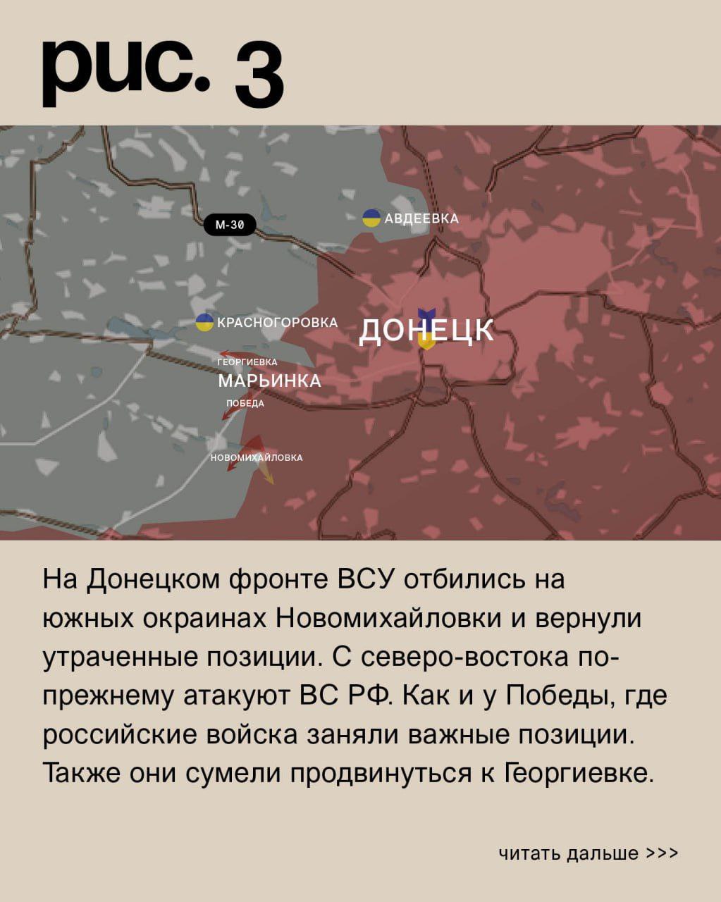 На Донецком фронте ВСУ отбились на южных окраинах Новомихайловки и вернули утраченные позиции. С северо-востока по-прежнему атакуют ВС РФ. Как и у Победы, где российские войска заняли важные позиции. Также они сумели продвинуться к Георгиевке. На юго-восточных окраинах Авдеевки – жёсткие встречные бои. На северо-восточных – небольшое продвижение ВС РФ у коксохимического завода. (Рис. 3)