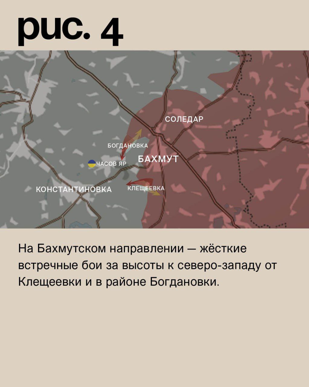 На Бахмутском направлении – жёсткие встречные бои за высоты к северо-западу от Клещеевки и в районе Богдановки. (Рис. 4)