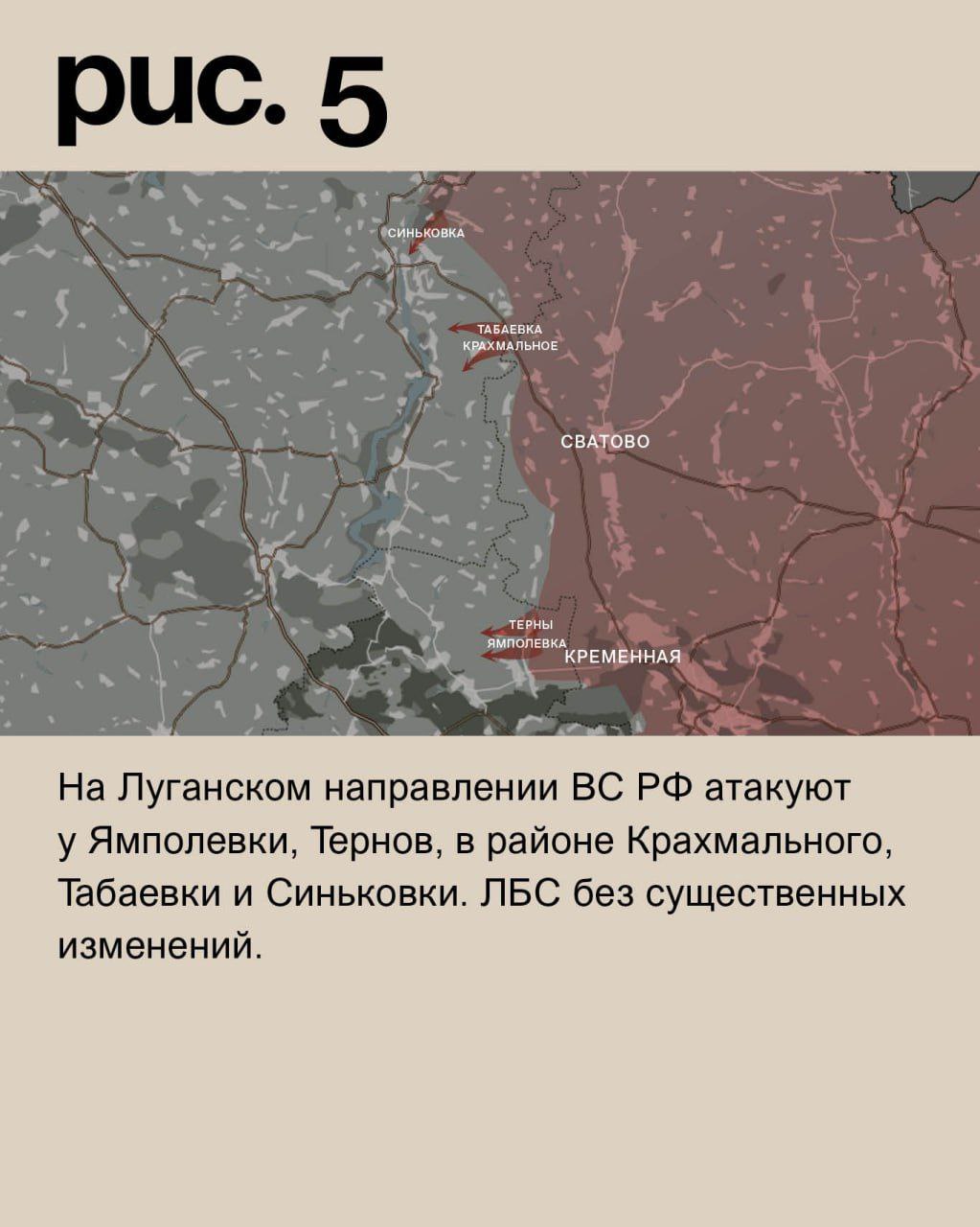 На Луганском направлении ВС РФ атакуют у Ямполевки, Тернов, в районе Крахмального, Табаевки и Синьковки. ЛБС без существенных изменений. (Рис. 5)