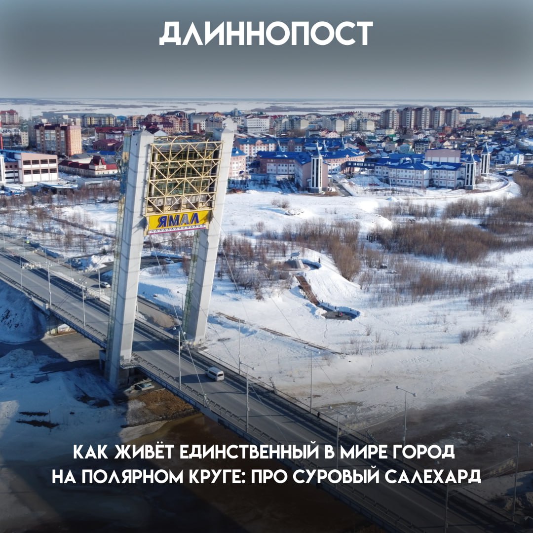 Единственный город в мире, который стоит прямо на Полярном круге — и это не «посёлок на три дома», а вполне живой Салехард. Дорога в город одна, дальше — тундра, дома на сваях из-за вечной мерзлоты, по городу ходят мамонты (в виде скульптур), а в соседний город зимой едут по льду Оби.