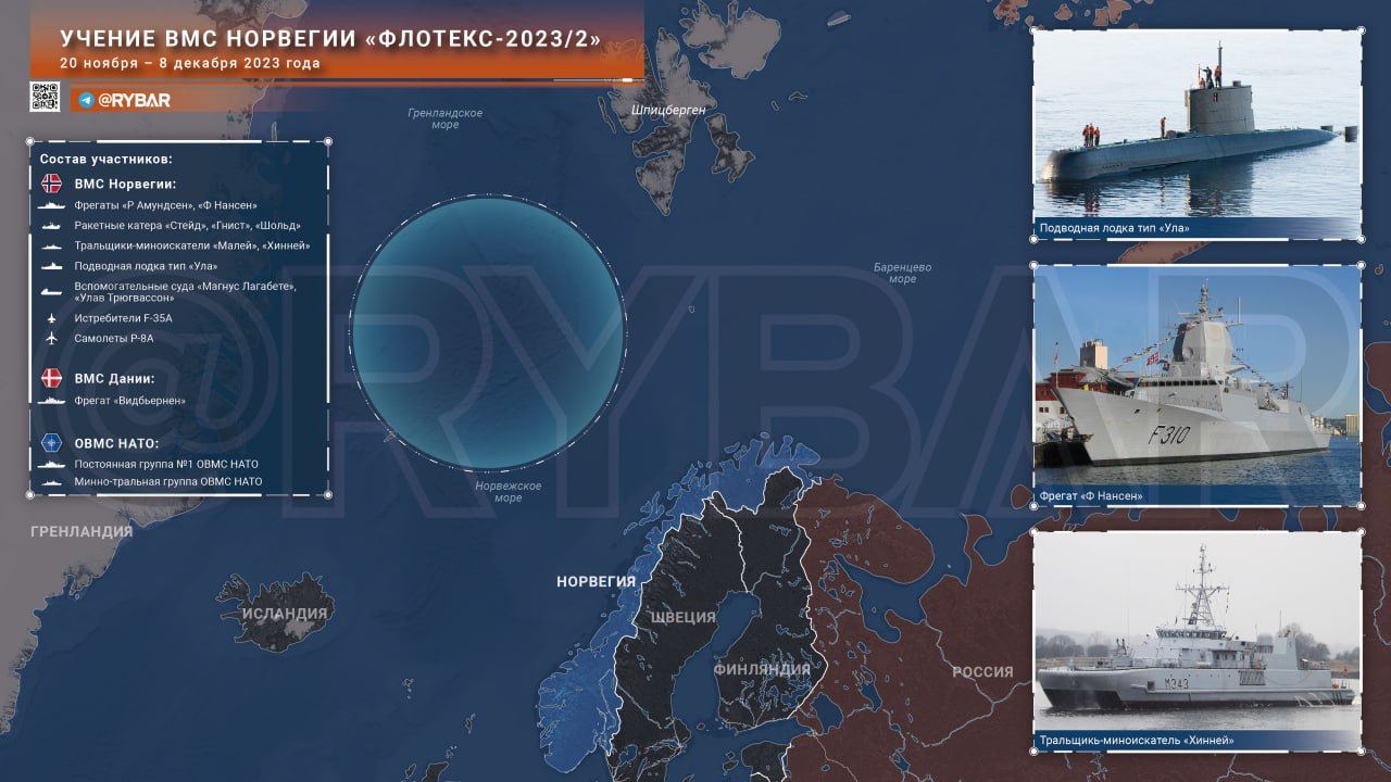 С 20 ноября в акватории Норвежского моря проходят учения ВМС Норвегии и стран-партнеров «Флотекс-2023/2». Активные тренировки запланированы с 28 ноября по 4 декабря.