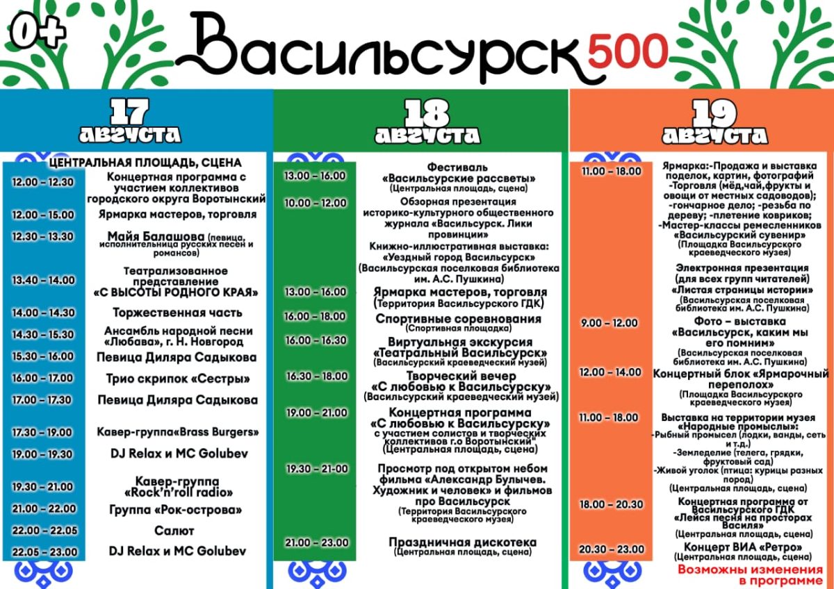 18 августа на территории краеведческого музея в 16.00 пройдет виртуальная экскурсия «Театральный Васильсурск», в 19.30 — просмотр под открытым небом фильма «Александр Булычев. Художник и человек» и других фильмов про Васильсурск. В 13.00 на центральной площади поселка откроется фестиваль «Васильсурские рассветы», в 19.00 начнется концертная программа «С любовью к Васильсурску» с участием творческих коллективов г. о. Воротынский. В 21.00 — праздничная дискотека