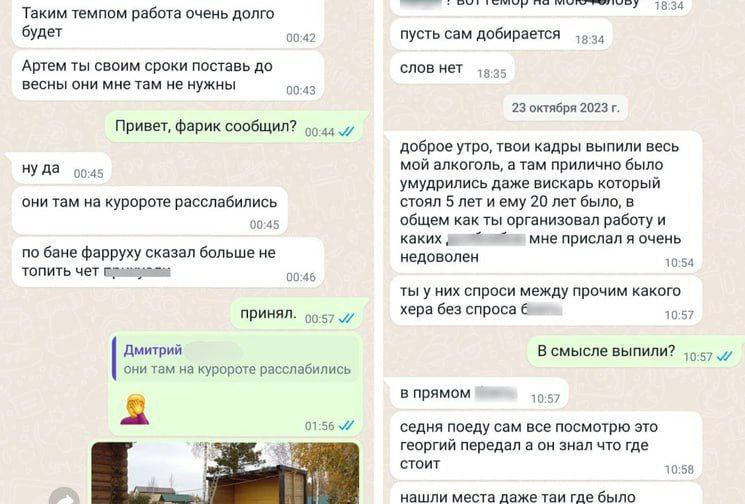 Директор «Рихтера» тоже поделился скриншотами переписок. В них некий Дмитрий — по всей видимости, заказчик работ — утверждает, что сотрудников ему «прислал» Артем Полянский. А также сообщает, что «кадры выпили весь алкоголь» и он «очень недоволен». Последнее сообщение пришло 23 октября — через два дня после происшествия на стройке.