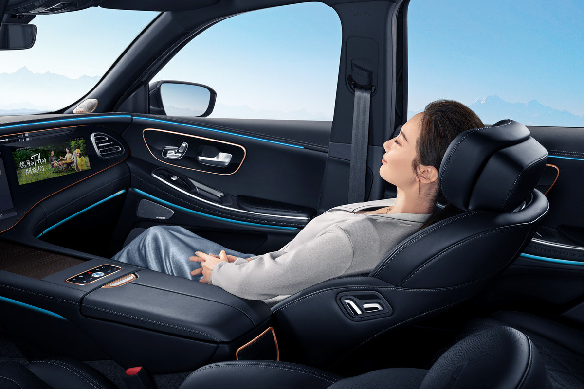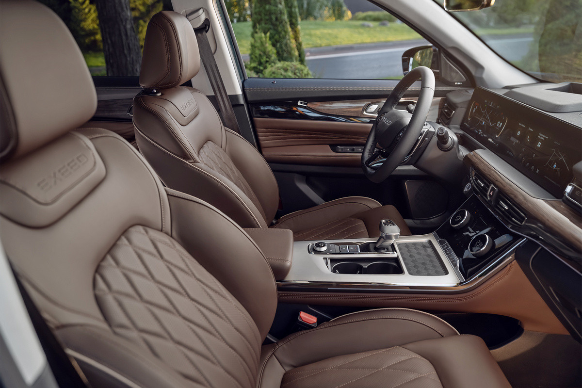 Exeed VX также имеет новый руль с сенсорными кнопками, а за переключение передач отвечает правый подрулевой рычажок. Управление настройками кресел вынесли на двери – опять же, как у Mercedes-Benz. Кроме того, улучшили сами сиденья, вдобавок в список оборудования вошли обогрев и вентиляция первого и второго рядов (передние кресла – еще и с массажером) и система активного шумоподавления. В Китае Exeed VX International Edition предложен с шести- или семиместным салоном.