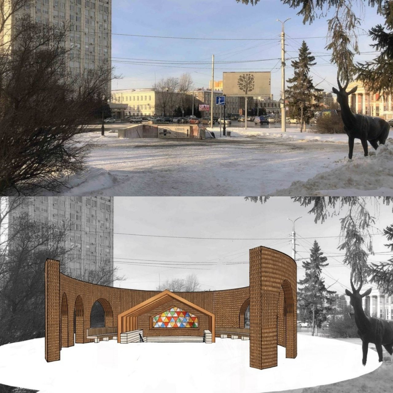 — Еще здание трансформаторной подстанции, разрисованное журавлями, на Интернациональной, закрывает вид на Успенский собор. На мой взгляд, это не совсем уместно. Появилось желание его прикрыть. Отсюда появилась тема арок. Также хочется преобразить непрезентабельный подземный переход. Еще одна проблема — вентиляционные шахты, которые выглядят эстетически непривлекательно. Их можно задекорировать прозрачным структурным каркасом из деревянных брусков. Еще решаются проблемы по обслуживанию самого Собора — у него нет мусорной площадки, места для складирования инвентаря и места для уборочной техники. По концепции я предусмотрел это.