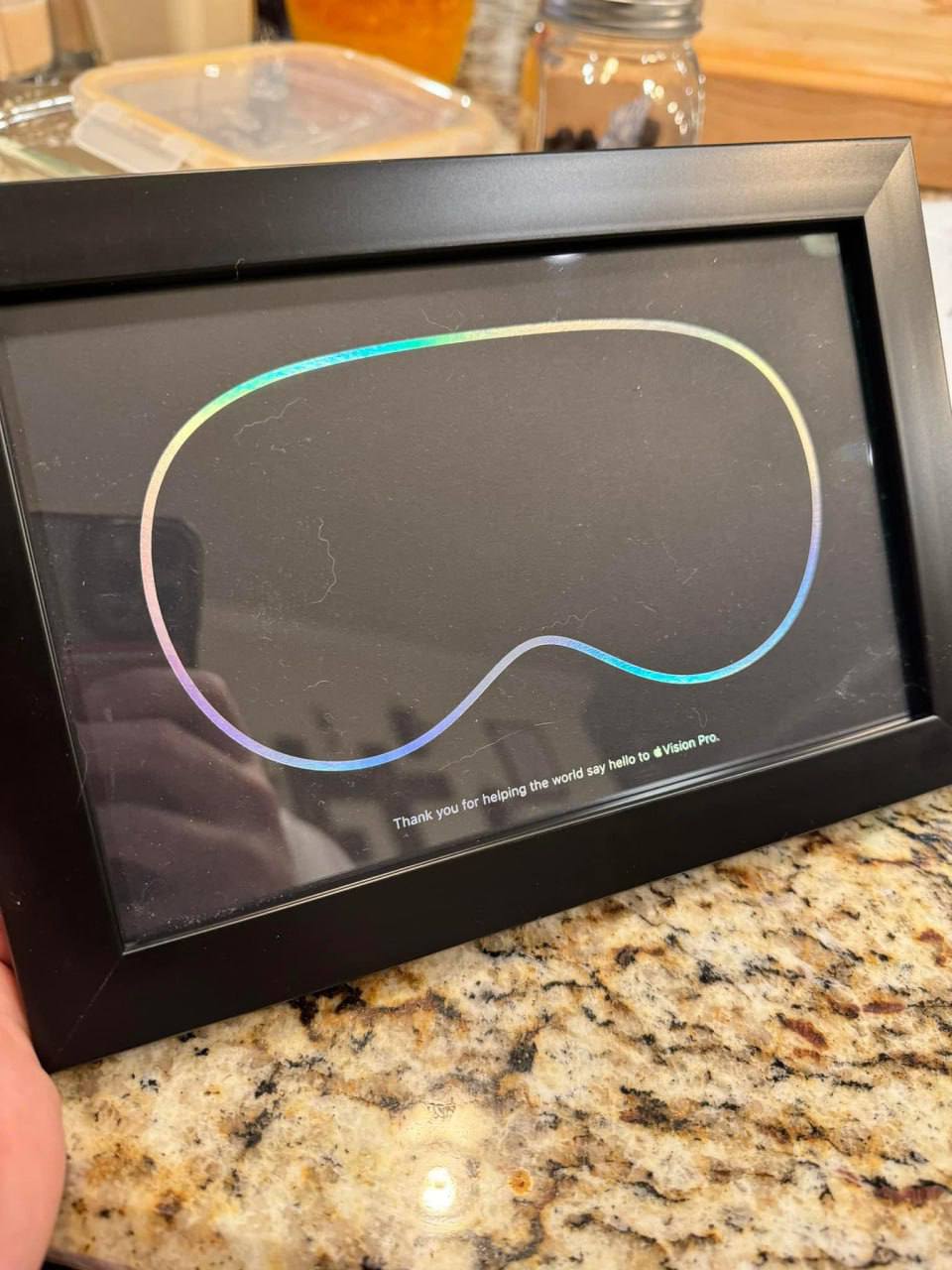 Apple решила поблагодарить сотрудников, которые работали над Vision Pro, и подарила им VR-шлем рамку с бумажкой, на которой нарисован шлем и надпись: «Спасибо, что помогли миру познакомиться с Vision Pro». И больше ничего.