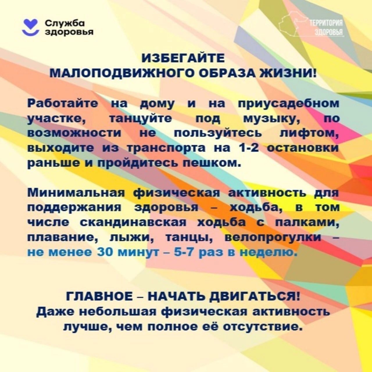 Организаторы информационной кампании подчёркивают доступность спортивных активностей даже вне специализированных учреждений: можно активно заниматься садоводством, устраивать танцевальные вечера, отказаться от пользования лифтом в многоэтажных домах, предпочитая ходьбу пешком, регулярно совершать небольшие прогулки. Врачи рекомендуют уделять физическим упражнениям ежедневно хотя бы полчаса пять-шесть раз в неделю, включая обычную ходьбу, лыжные походы зимой, катание на велосипеде летом, посещение бассейна или пляжа, участие в танцах и кружках фитнеса.