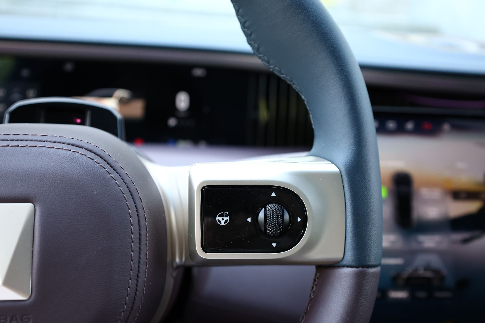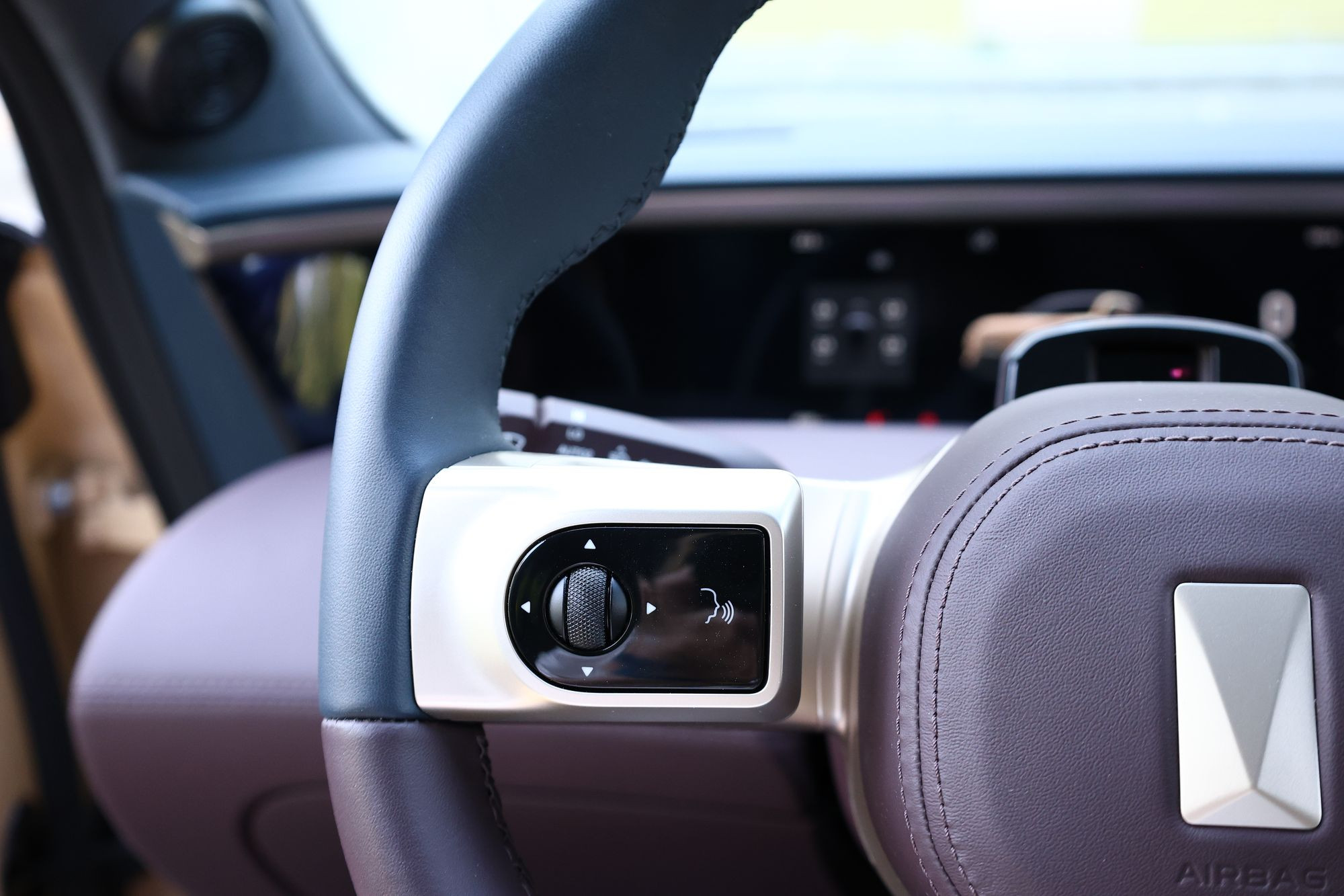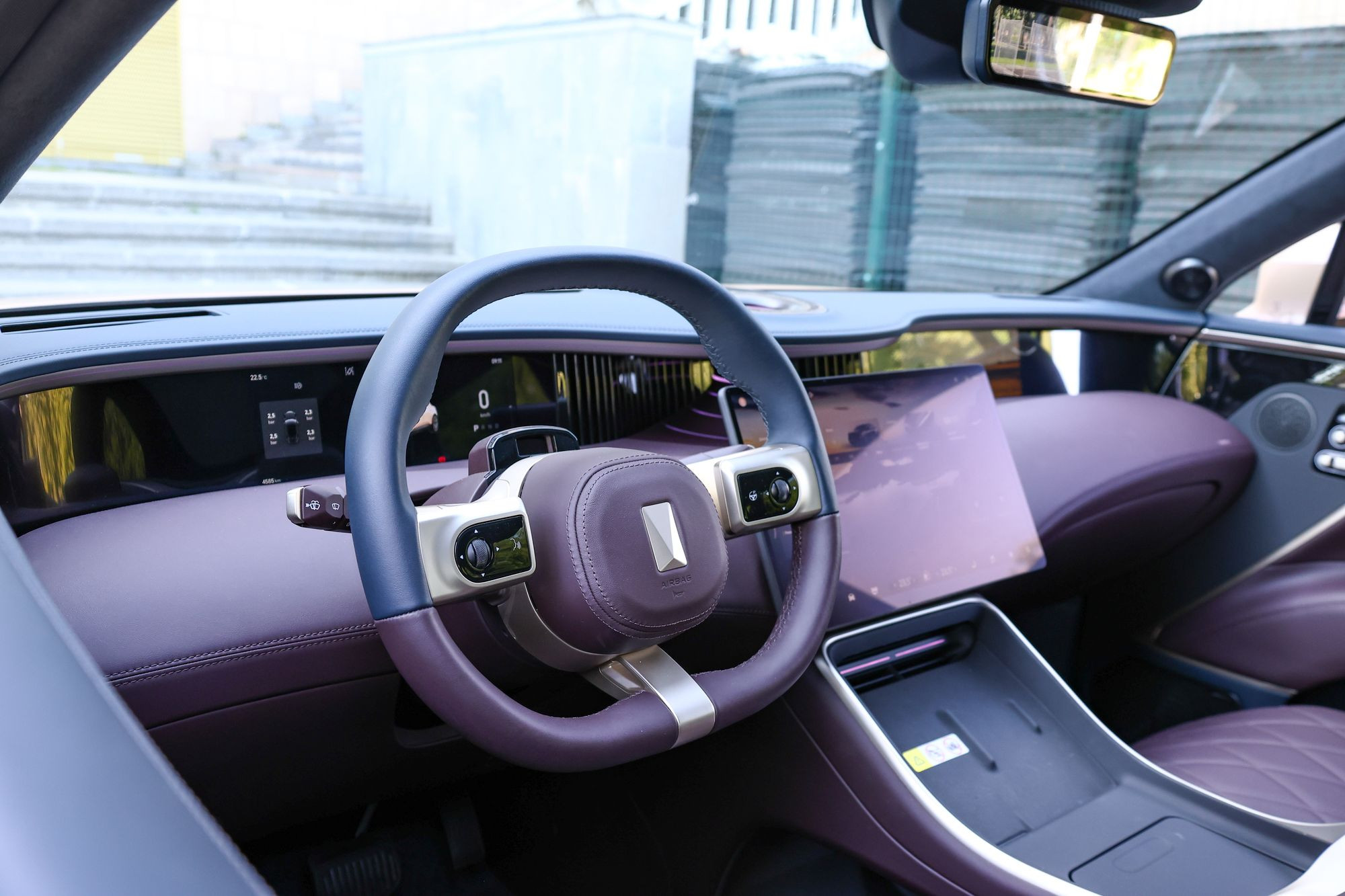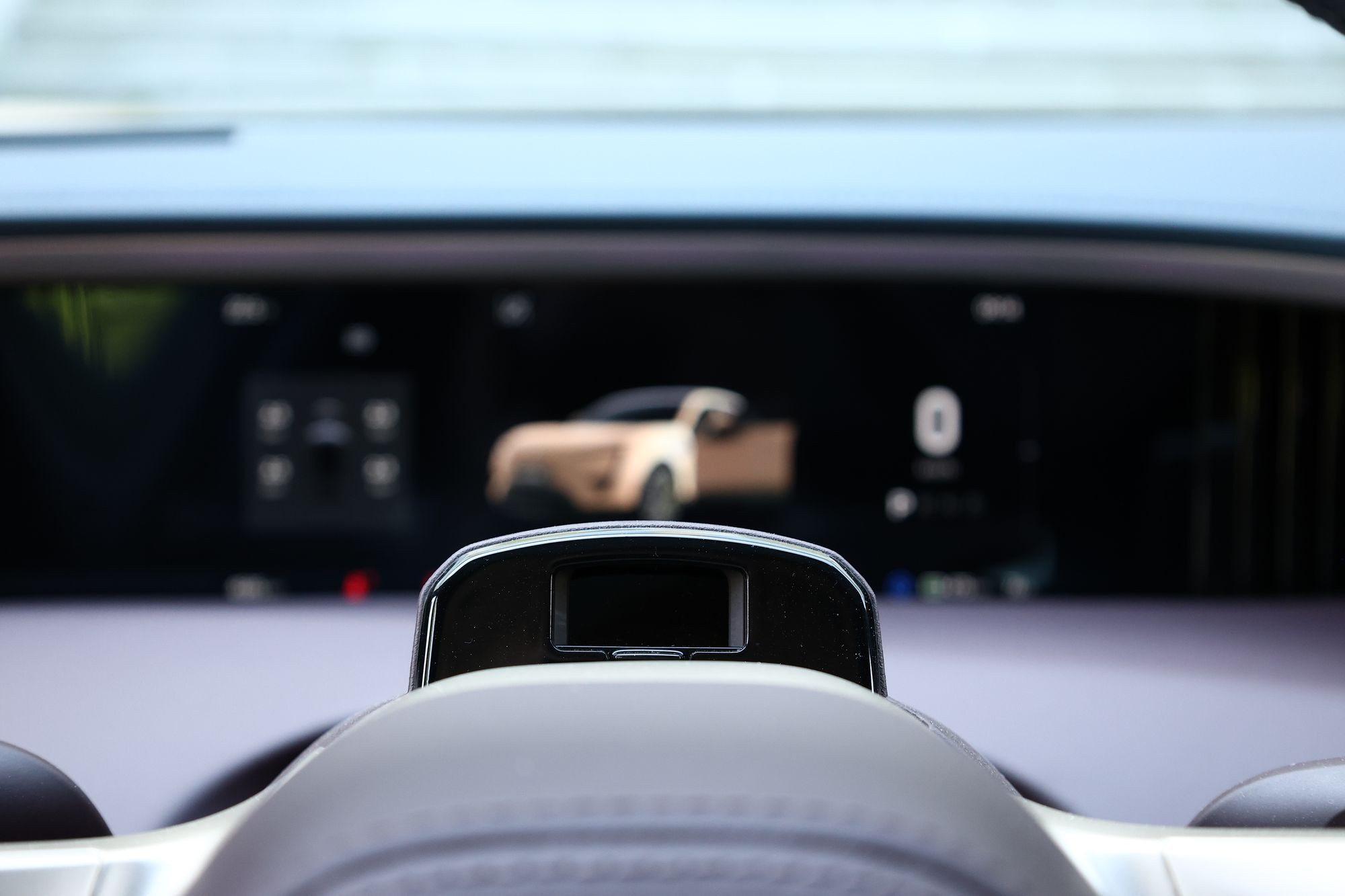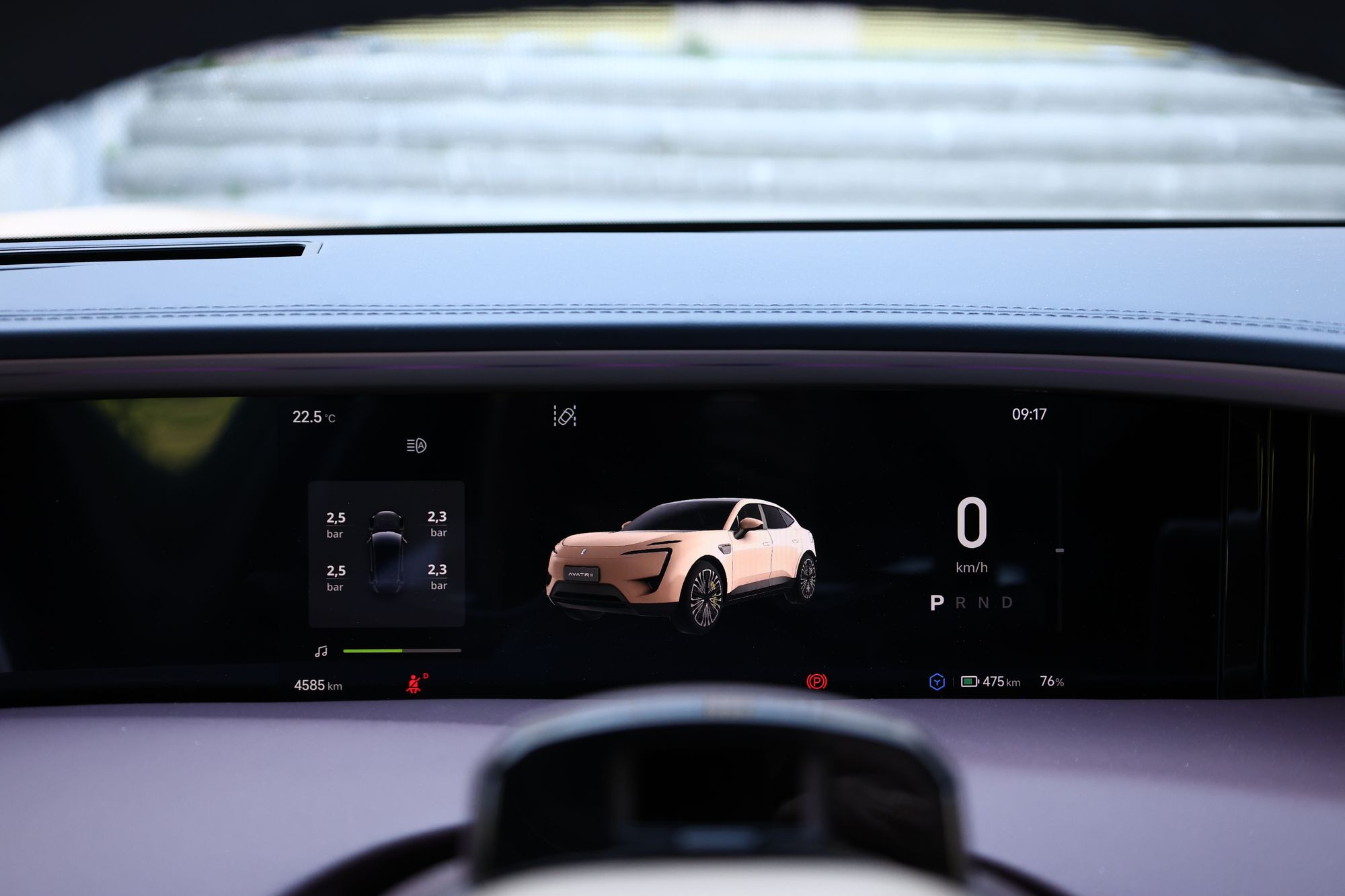 Восьмиугольный двухцветный руль относительно удобен. Спасибо, что он хотя бы почти круглый, к тому же у него хороши и металлические шарики на спицах. Маленькие «запонки» управления стеклоподъёмниками работают по обратному принципу, как в Geely. Кажется, у нас намечается новый тренд… Узкая приборная панель диагональю 10,25 дюймов бесполезна. А как иначе, если треть экрана занимают показания давления в шинах? Зачем? Лучше поставили бы сюда проекционный дисплей, но его в Avatr 11 не бывает.