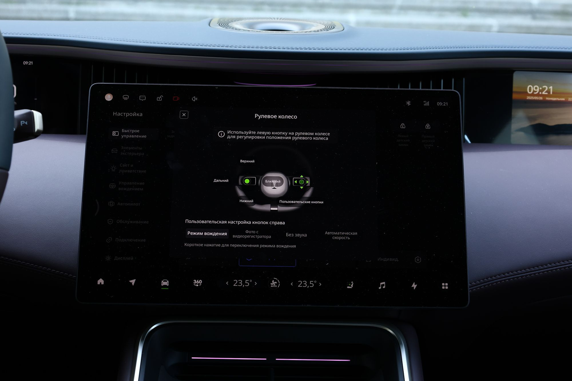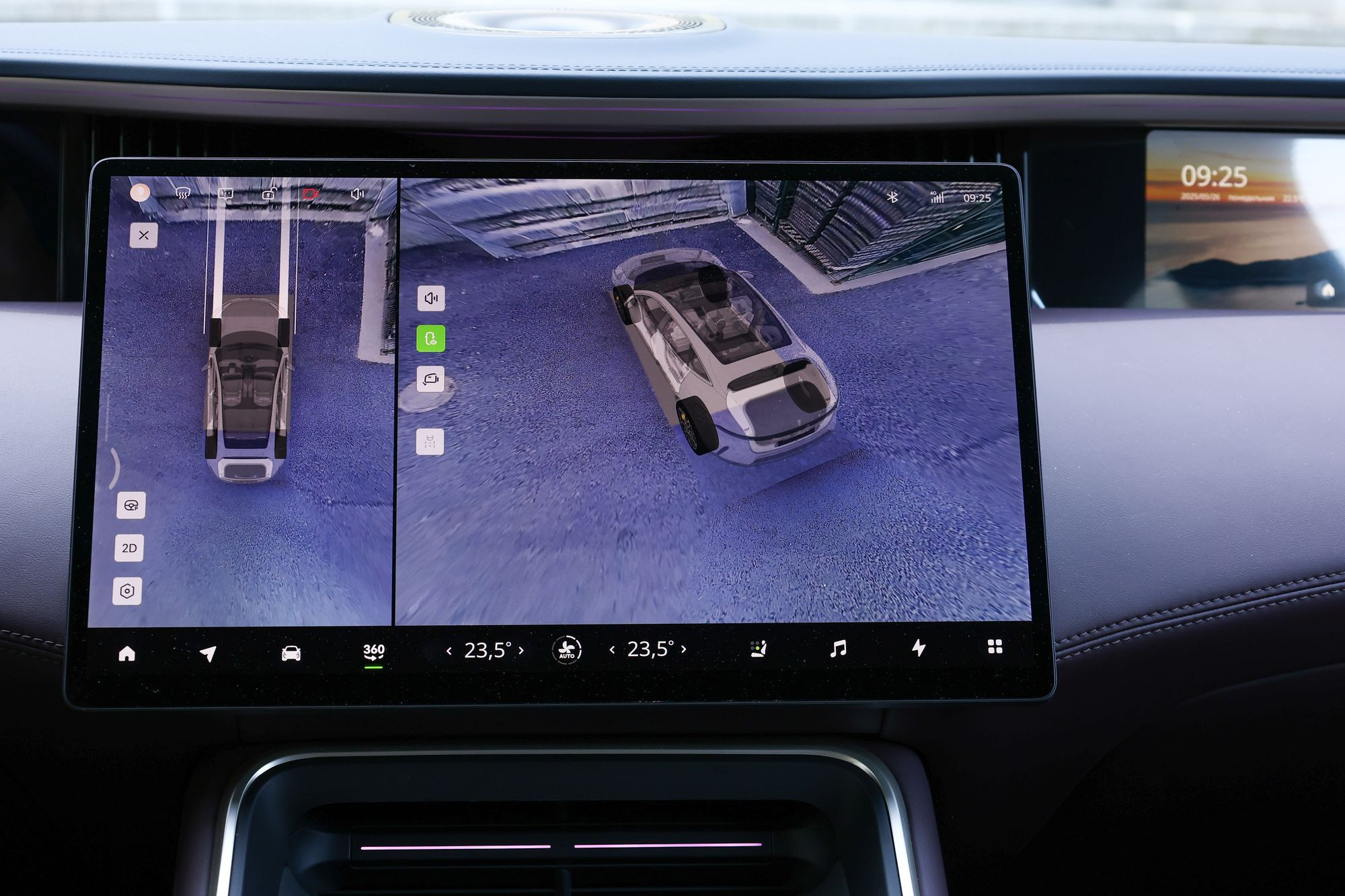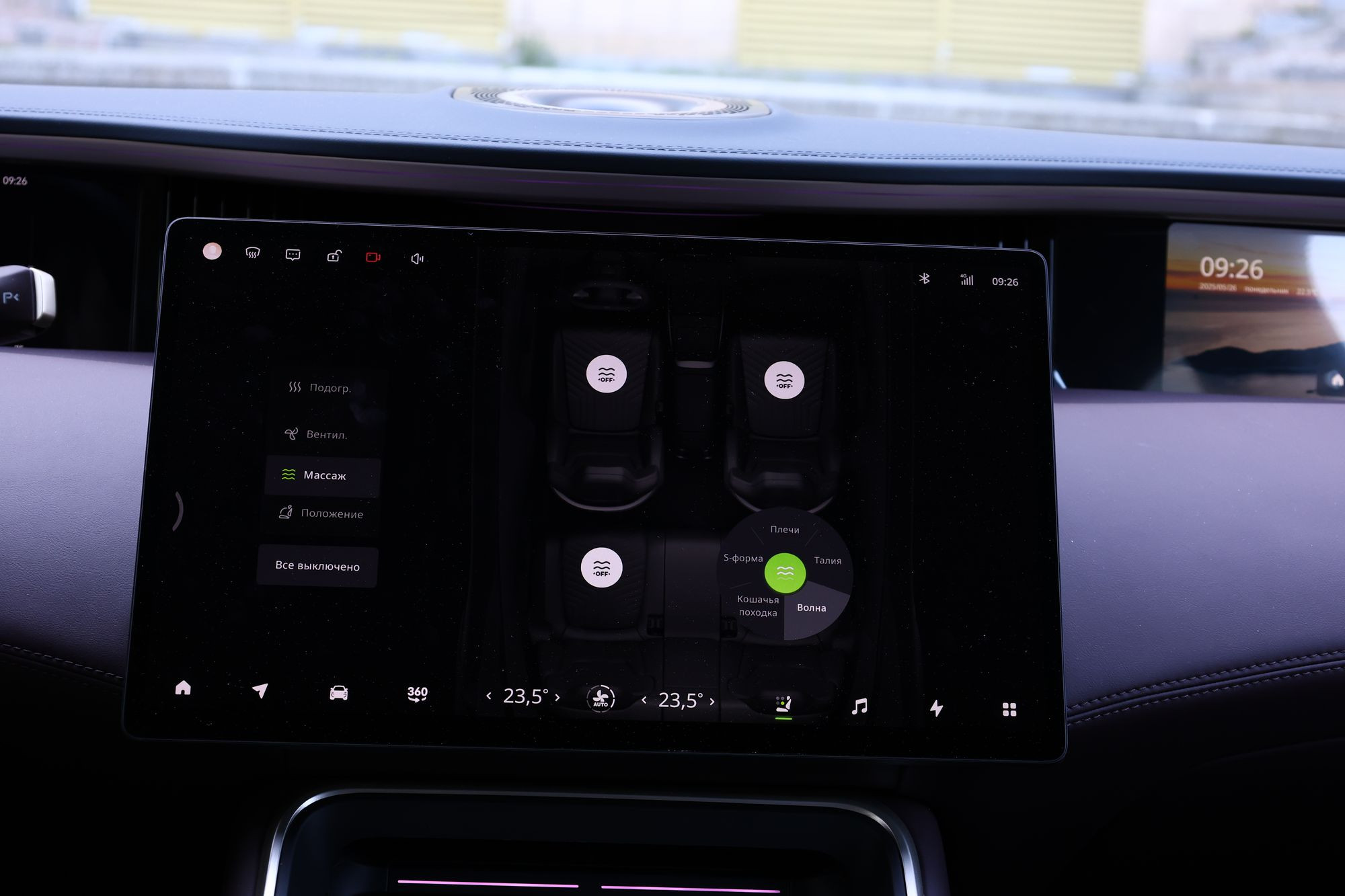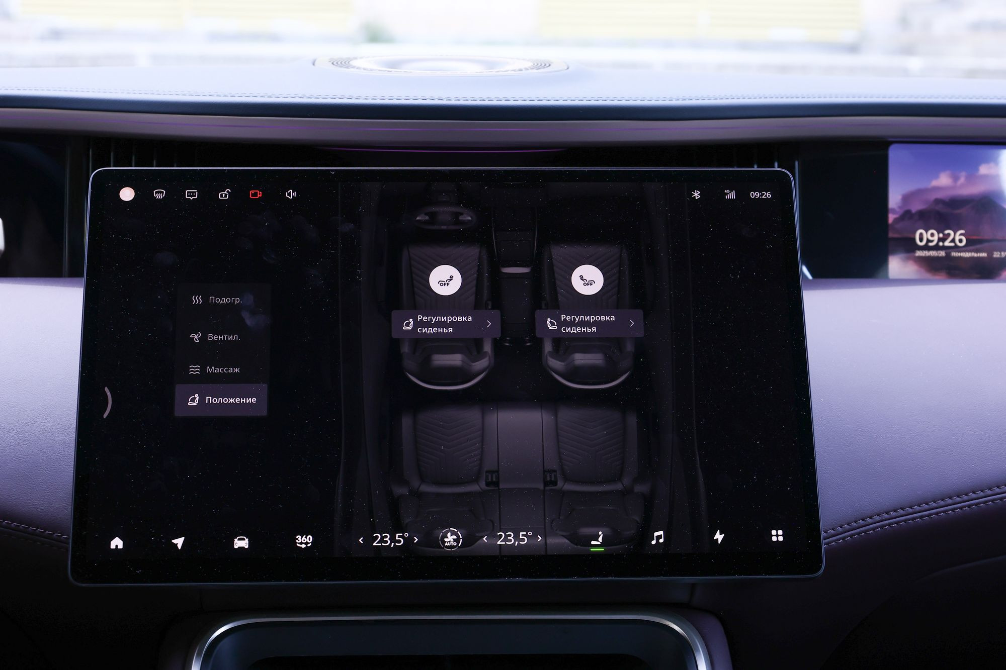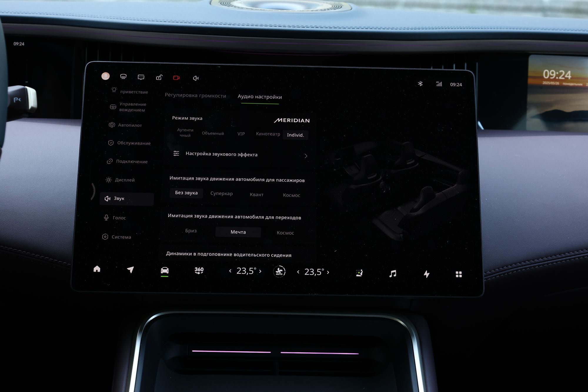 Третий экран в панели перед пассажиром нещадно бликует и нужен здесь, кажется, лишь для галочки. С него можно управлять музыкой, но в чём проблема сделать это с центрального дисплея, который расположен лишь чуточку левее? Аудиосистема Meridian с 25 динамиками, к слову, звучит на удивление невыразительно. Зато шумоизоляция отменная – слышно, как жужжат моторчики в дефлекторах климатической установки. Надо ли говорить, что направление обдува настраивается тоже через центральный дисплей?