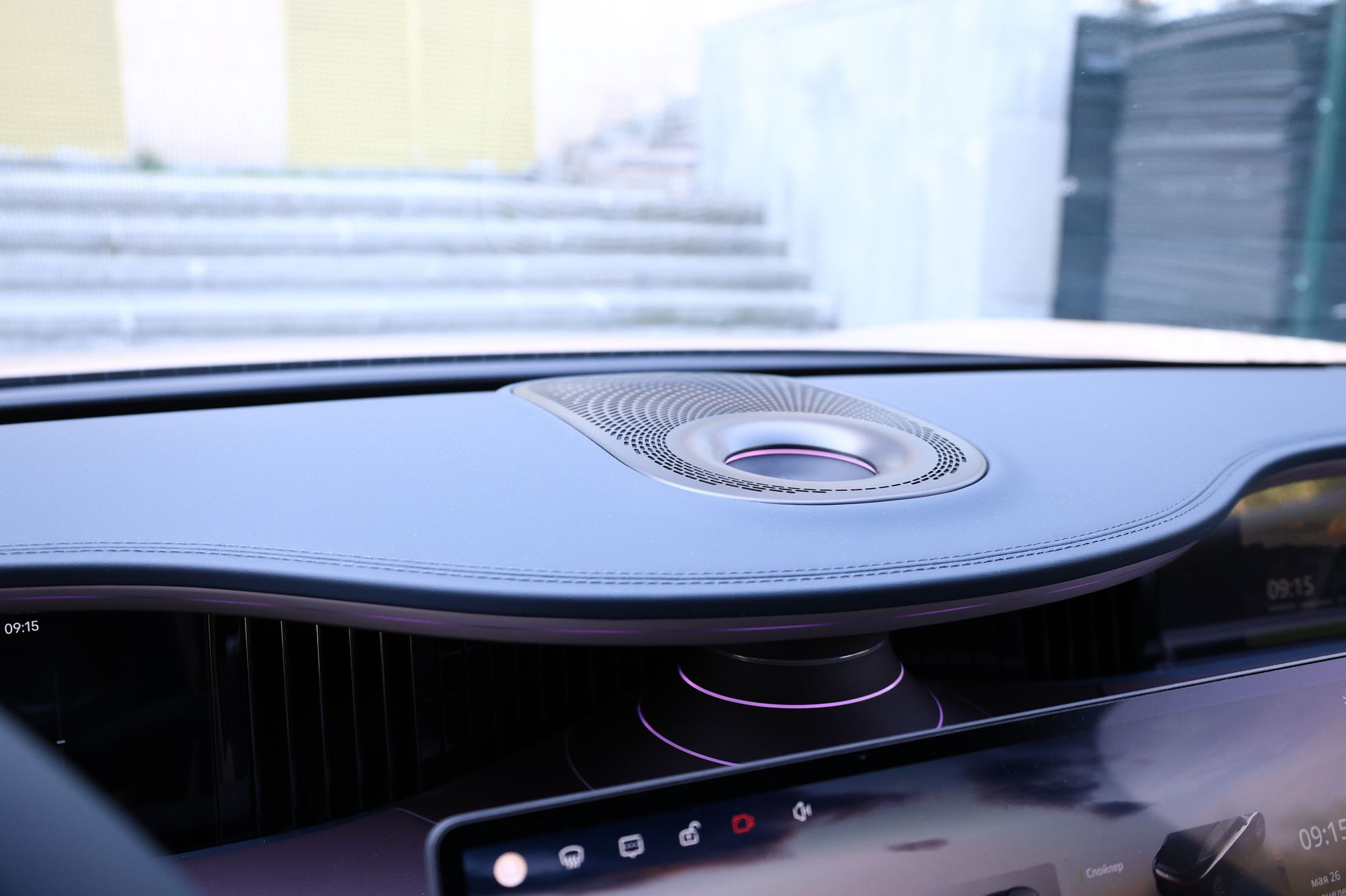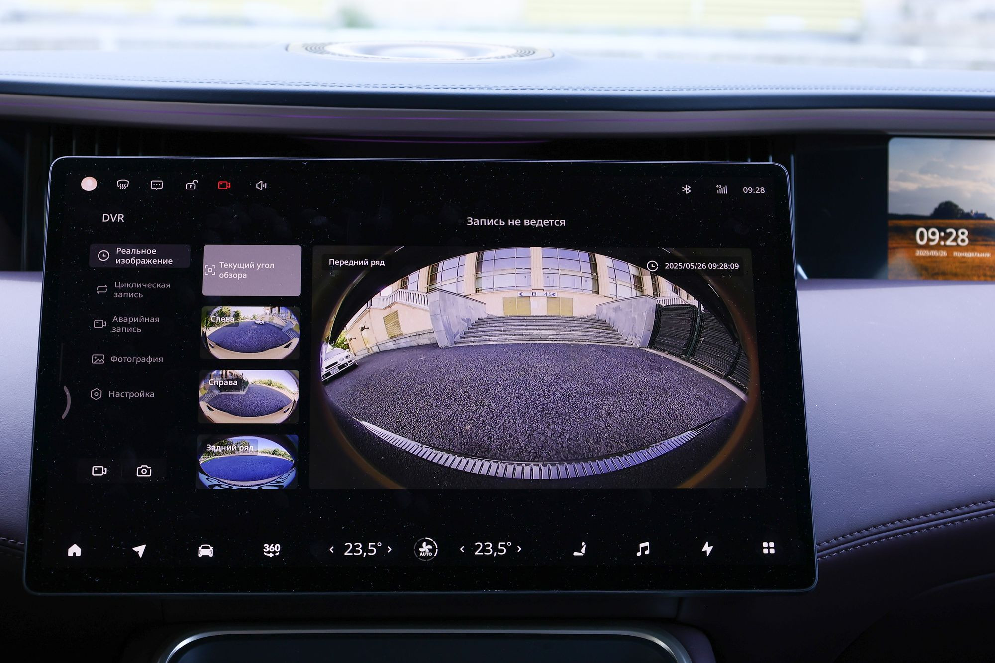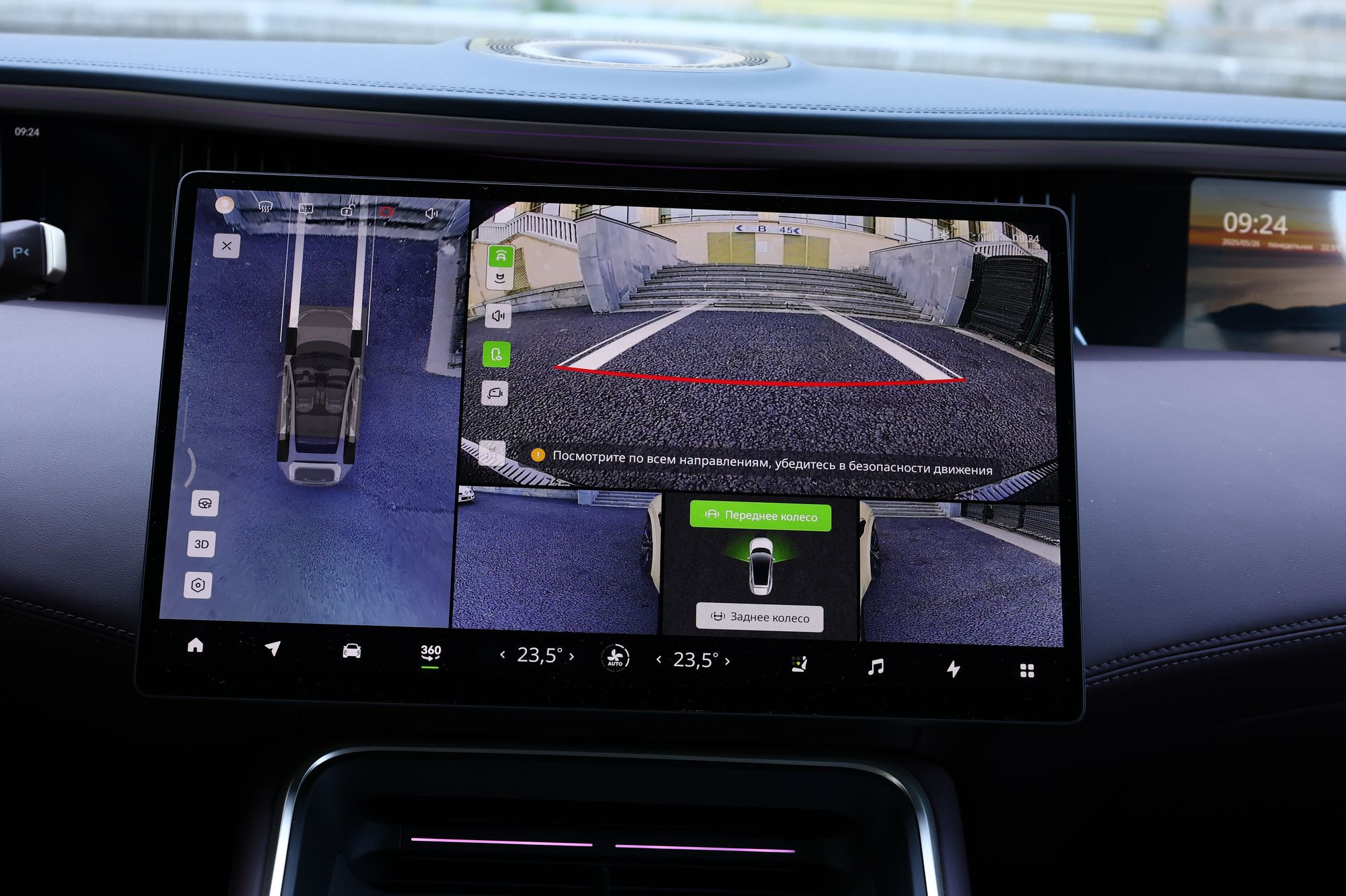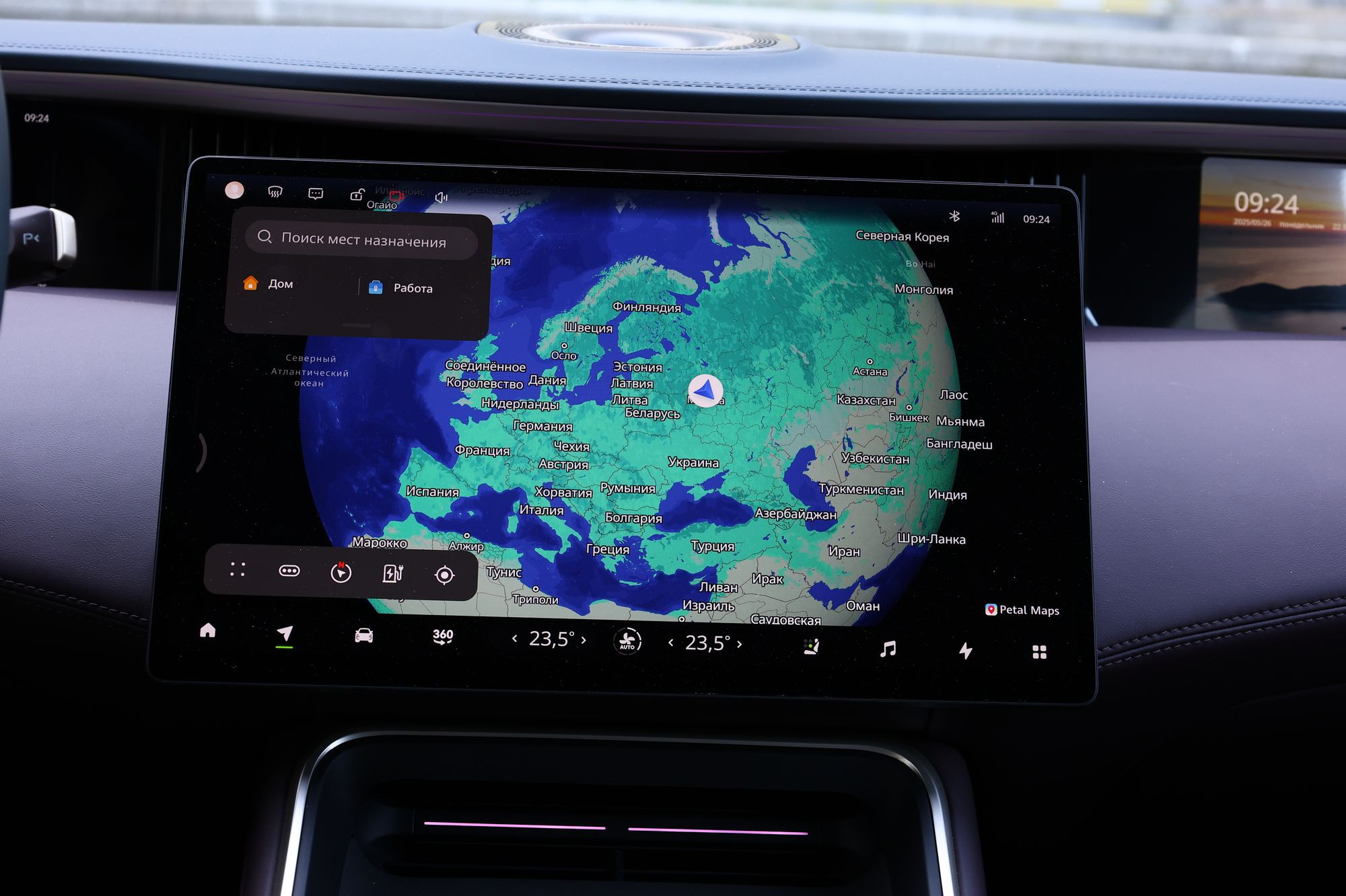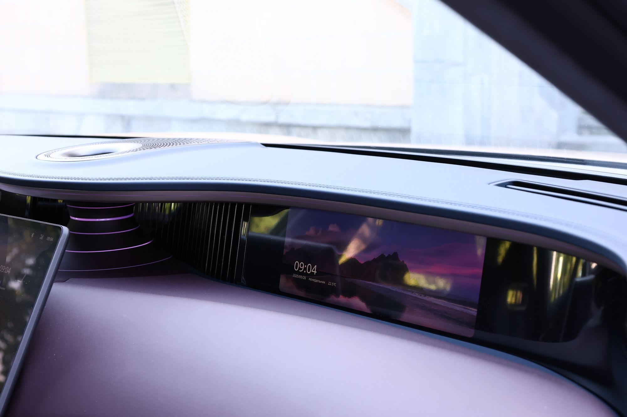 Третий экран в панели перед пассажиром нещадно бликует и нужен здесь, кажется, лишь для галочки. С него можно управлять музыкой, но в чём проблема сделать это с центрального дисплея, который расположен лишь чуточку левее? Аудиосистема Meridian с 25 динамиками, к слову, звучит на удивление невыразительно. Зато шумоизоляция отменная – слышно, как жужжат моторчики в дефлекторах климатической установки. Надо ли говорить, что направление обдува настраивается тоже через центральный дисплей?