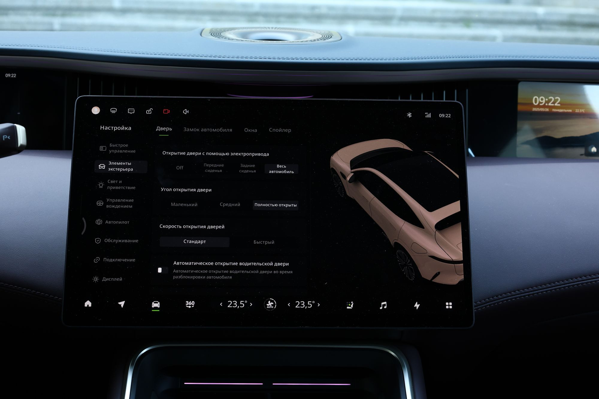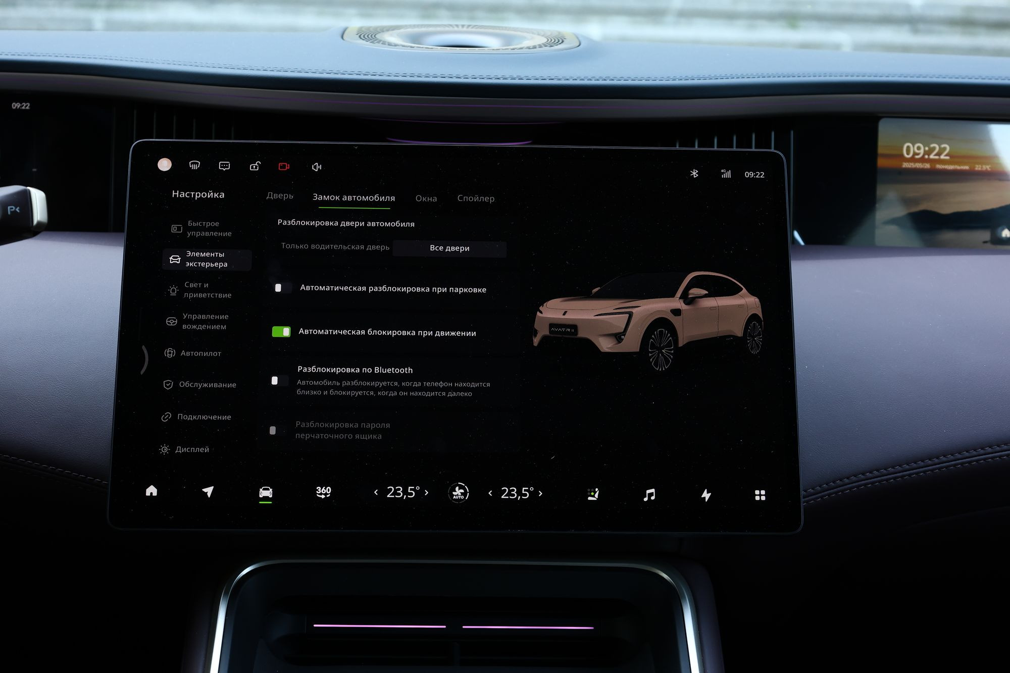 Двери у Avatr тоже с электроприводом. Теоретически это вполне удобно, но на практике – совсем не очень. Всё начинается с бесключевого доступа: ручки то выдвигаются навстречу, то нет. Причём безо всякой, казалось бы, закономерности. Вероятно, причина кроется в крайне чувствительных сенсорах, которые не позволяют дверям с размаху приложиться о препятствие. Они же порой не разрешают дверям открыться даже рядом с высокой травой. Вообще, от электроприводов больше неудобств – дверь иногда может всего лишь приоткрыться или начинает открываться и останавливается, а то и вовсе не хочет шевелиться. Зато водительская дверь закрывается от нажатия на педаль тормоза.