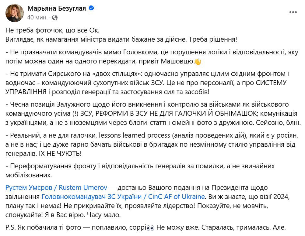 "Не надо фоточек, что все ок. Выглядит, как попытка министра выдать желаемое за действительное", — написала Безуглая и снова призвала уволить Залужного из-за отсутствия плана действий на будущий год.