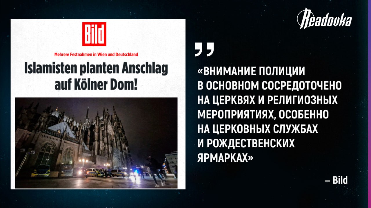 С раннего утра силовики проводят задержания всех причастных — аресты произведены в Вене и Германии. Целями терактов могут быть рождественские службы в Кельне, Вене и Мадриде. Сейчас полиция опечатала несколько центральных церквей — в том числе Кельнский собор. Так, с помощью собак-ищеек в венском соборе Святого Стефана ведется поиск взрывчатки.