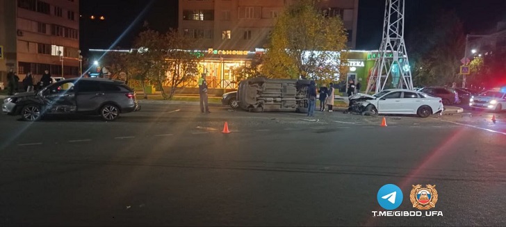 Накануне вечером, 27 сентября, в Уфе столкнулись четыре машины, одна из которых опрокинулась. Об этом сообщает Госавтоинспекция Уфы.