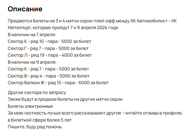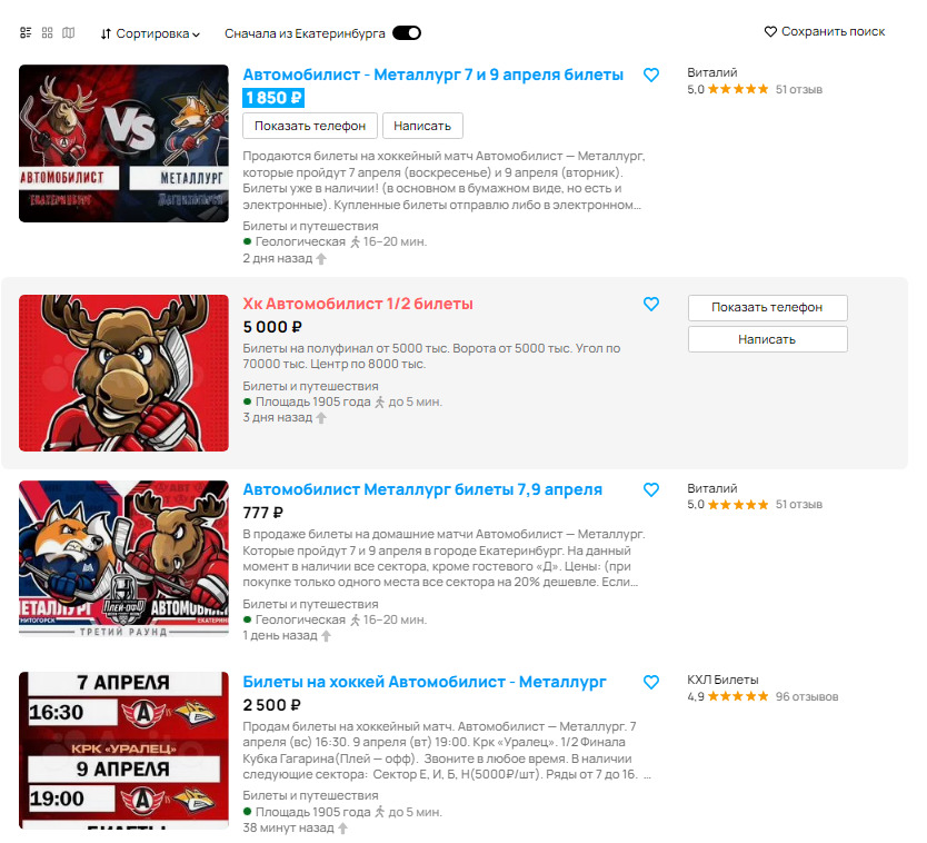— Почему творится коррупция в покупке билетов на хоккей очередной год? Купить билеты на сайте ХК «Автомобилист» трудно. Типа ажиотаж, зато на «Авито» приближенные продают их в разы дороже. У меня многодетная семья и все хотели бы попасть на матч, как, допустим, в НХЛ, но у нас опять какие-то перепродавцы. Люди делают на играх плей-офф состояния, — возмущается читатель E1.RU.