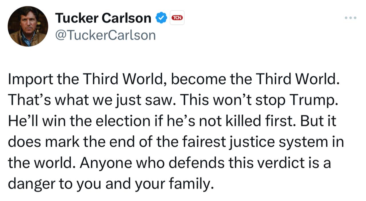 Импортируйте третий мир, потом станьте третьим миром. Это то, что мы только что видели. Это не остановит Трампа. Он победит на выборах, если его не убьют первым. Но это знаменует собой конец самой справедливой системы правосудия в мире. Любой, кто защищает этот вердикт, представляет опасность для вас и вашей семьи.
