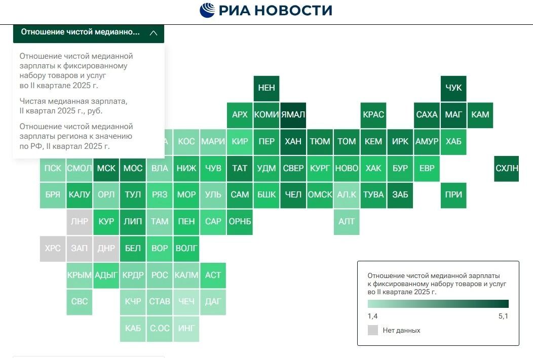 «Медианные зарплаты по регионам (за вычетом НДФЛ) рассчитаны на основе официальной статистики за апрель–июнь 2025 года. Фиксированный потребительский набор взят из региональной статистики Росстата», — говорится в комментарии РИА Новости к инфографике.