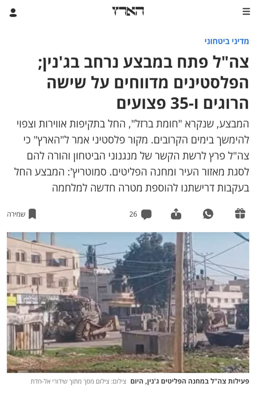 Нетаньяху объявил о начале «масштабной операции по искоренению терроризма» в городе Дженин (Палестинская автономия) на Западном берегу реки Иордан. Операция получила название «Железная стена», сообщает израильская газета Haaretz.