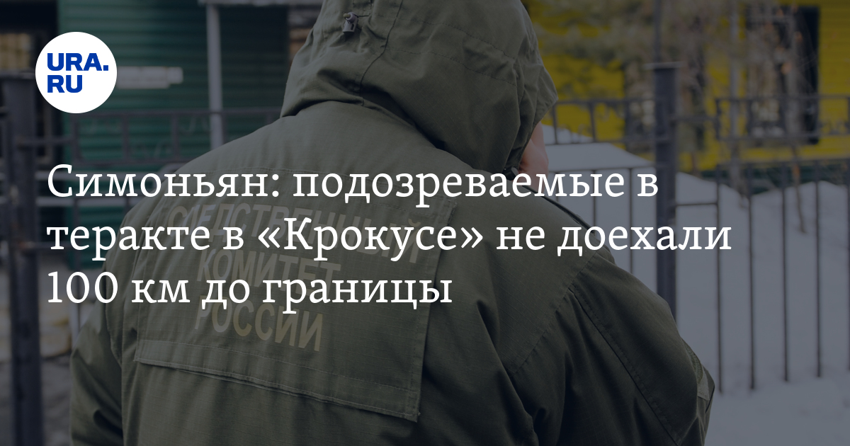 Подозреваемые в теракте в «Крокус Сити Холле» не доехали до границы с Украиной 10 километров. Об этом рассказала главред медиагруппы «Россия сегодня» и телеканала RT Маргарита Симоньян.
