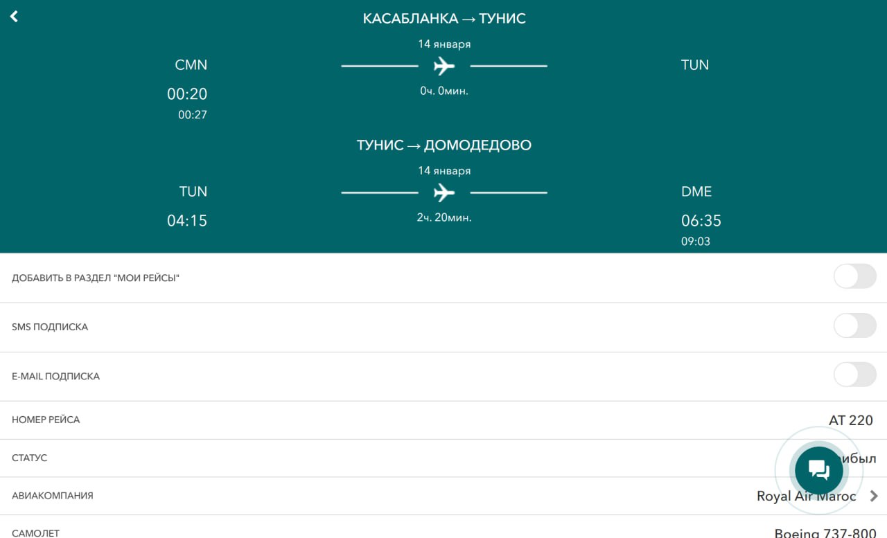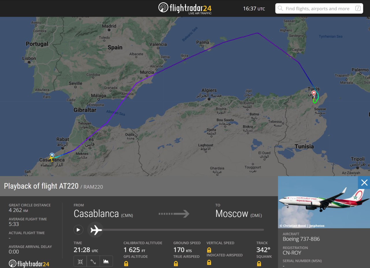 Марокканская Royal Air Maroc уже несколько дней подряд выполняет рейс AT220 Касабланка — Москва с промежуточной посадкой в Тунисе, заметили @marocrus. Причём обратный рейс AT221 выполняется напрямую.