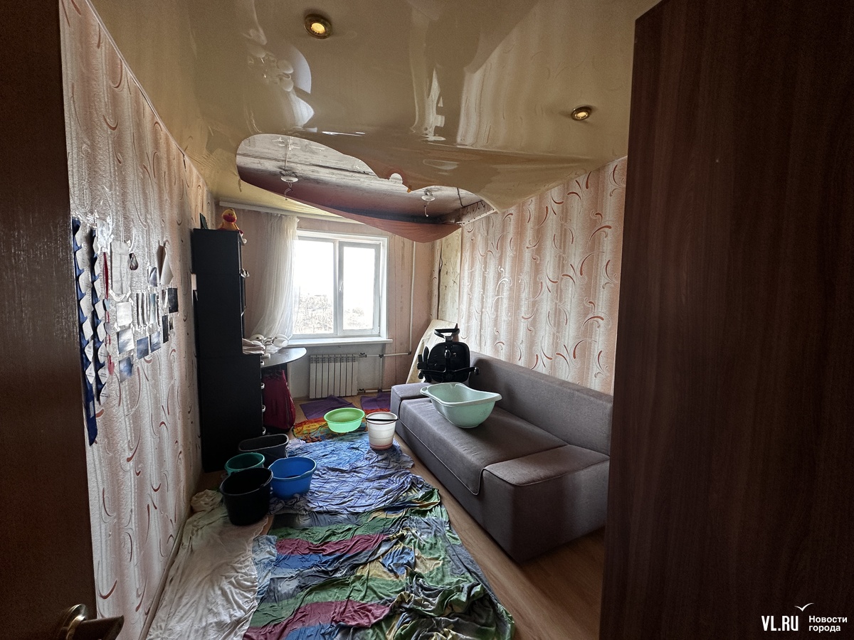 Затопленная квартира имеет две комнаты – пострадали обе. Больше всего досталось «детской». Часть натяжного потолка оборвалась, а на полу лежат мокрые тряпки и вёдра, в которые до сих пор капают остатки воды. Состояние второй комнаты получше, там в натяжном потолке скопилось лишь чуть-чуть воды. Хотя, как отмечает Алтына, её уже сливали, но набежало ещё.