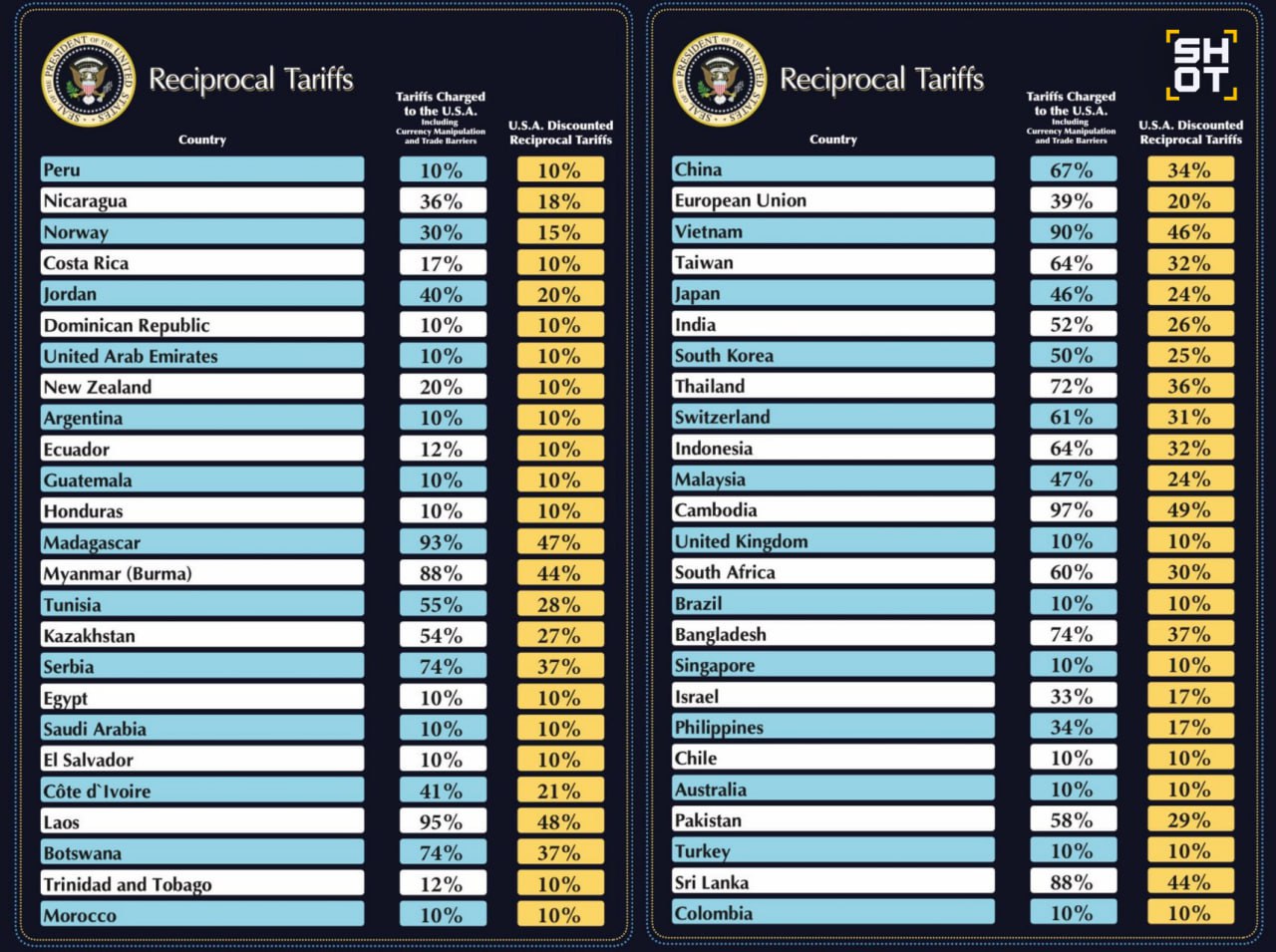 — Самые высокие тарифы у Камбоджи (49%), Вьетнама (46%), Таиланда (36%), Китая (34%), Тайваня (32%) и ЮАР (30%).