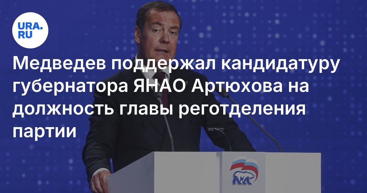 Заместитель председателя Совета Безопасности РФ и председатель партии «Единая Россия» Дмитрий Медведев поддержал кандидатуру губернатора ЯНАО Дмитрия Артюхова на должность секретаря реготделения партии. Об этом сообщает пресс-служба партии в своем telegram-канале.