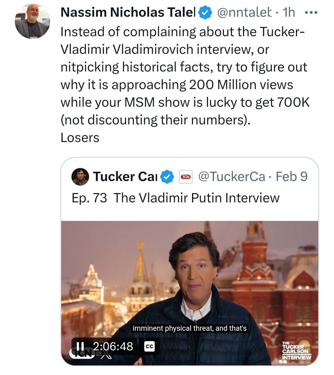Экономист Насим Талеб шокирован тем, что интервью Путина имеет 200 млн просмотров в Twitter. Обычный канал в США в лучшем случае наберет 700 тысяч.