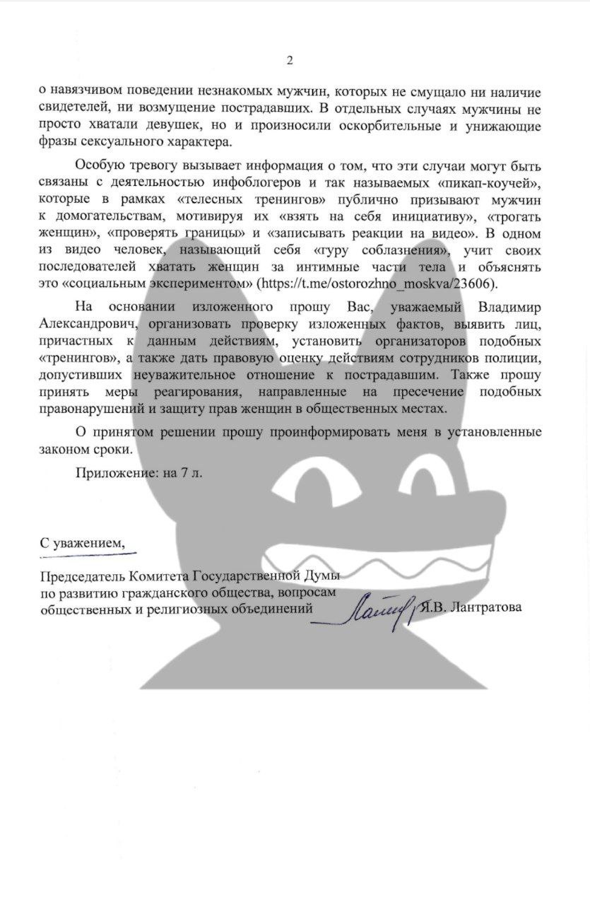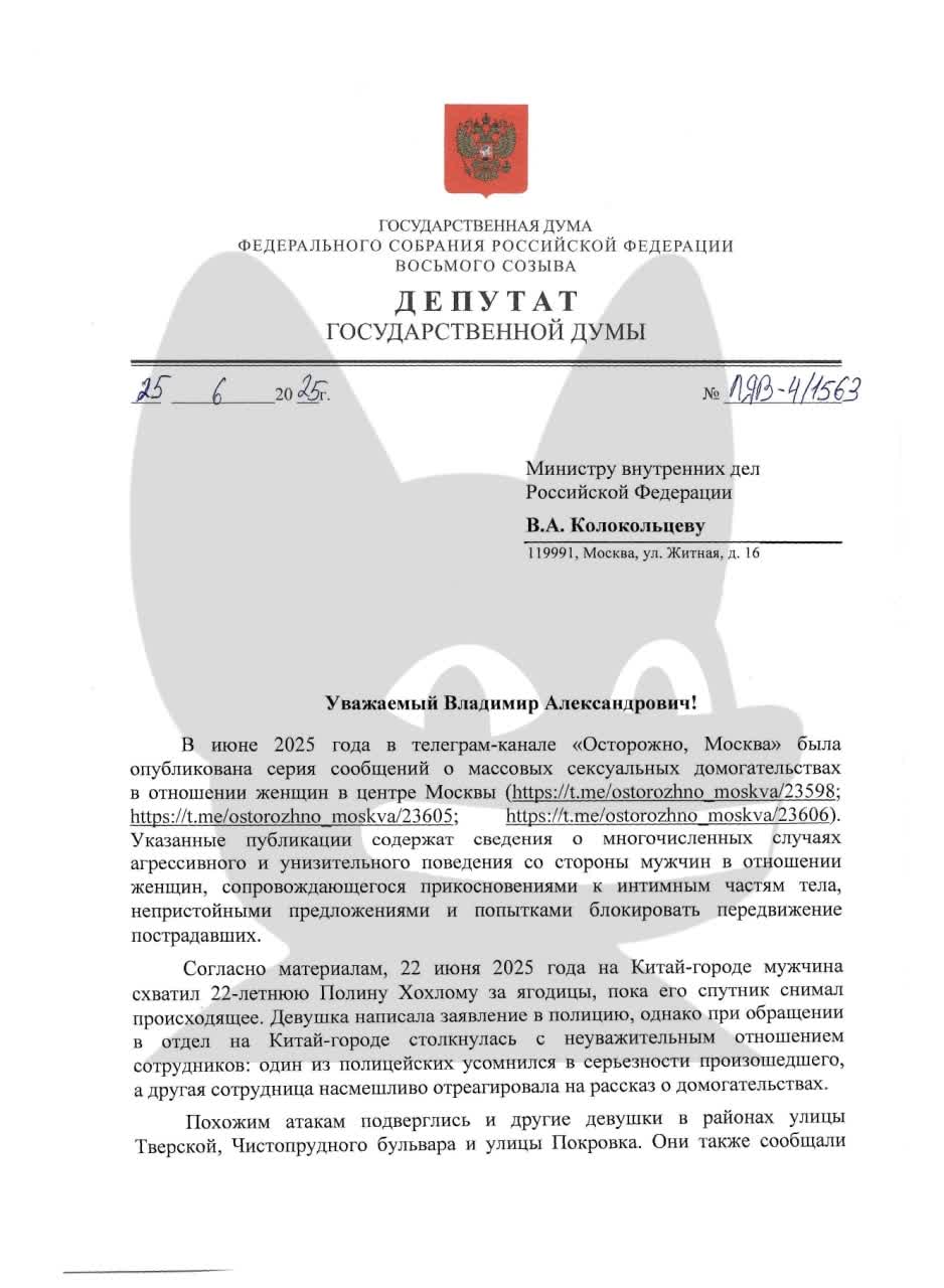 Депутат ГД обратила внимание на ситуацию после серии публикаций в нашем телеграм-канале Осторожно, Москва. По её словам, особую тревогу вызывает ситуация, которая может быть связана с деятельностью инфоблогеров и так называемых «пикап-коучей», которые в рамках «телесных тренингов» публично призывают мужчин к домогательствам, мотивируя их «взять на себя инициативу», «трогать женщин», «проверять границы» и «записывать реакции на видео»: