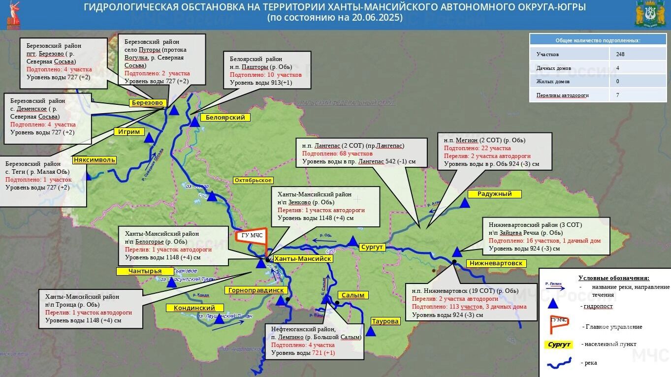 В Ханты-Мансийском районе сохраняются переливы дорог в Белогорье, Зенково и Троице. В Кышике все еще подтоплены 4 участка домов. Вода в Оби в этом муниципалитете поднялась на 4 см до 1148 см.