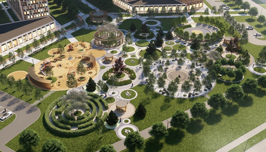 Как рассказал "ДП" руководитель бюро "А. Лен" Сергей Орешкин, через весь жилой комплекс пройдёт круговой пешеходный маршрут с необычным мощением, озеленением и велодорожкой — "Аллея звёзд". Он почти не будет пересекаться с уличной сетью. Вдоль этой аллеи сосредоточится социальная инфраструктура, кроме того, здесь появятся несколько общественных пространств, будет организовано четыре площади: с амфитеатром, для активных видов спорта, для ярмарок, а также главная — с фонтаном.