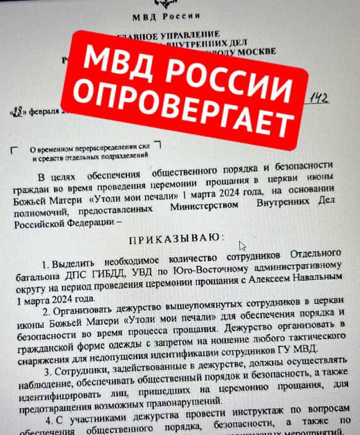 ❗️МВД РФ опровергло информацию о якобы появившемся приказе начальника ГУ МВД России по городу Москве об организации дежурства личного состава 1 марта в районе места проведения траурного мероприятия.